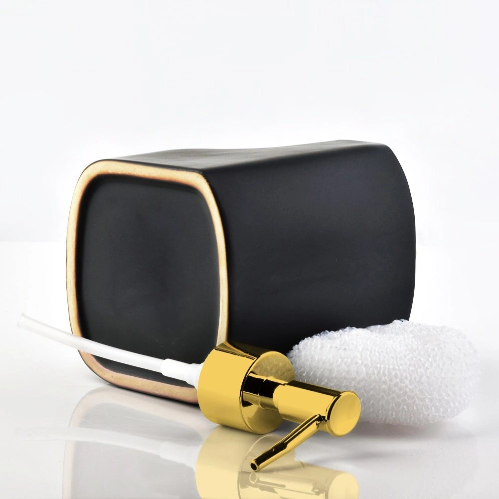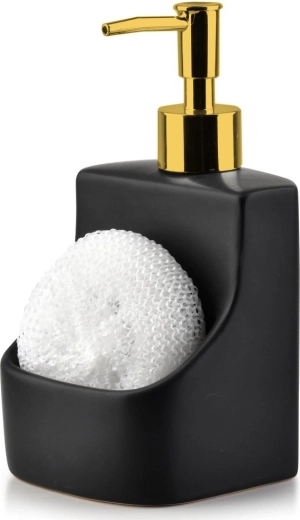 Praktický dávkovač na mycí prostředek kombinuje dispenzor a organizér na houbičku v jednom. Díky integrované kapse máte čisticí pomůcky vždy po ruce a pracovní plocha zůstane čistá a uspořádaná. Matná černá keramika s kontrastní zlatou pumpičkou se skvěle hodí do moderních, klasických i industriálních kuchyní.