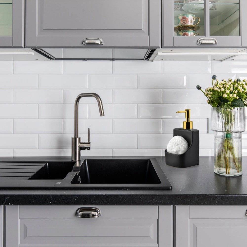 Kompaktní design s držákem udržuje saponát i houbičku na jednom místě. Ideální pro každodenní použití v moderní kuchyni.