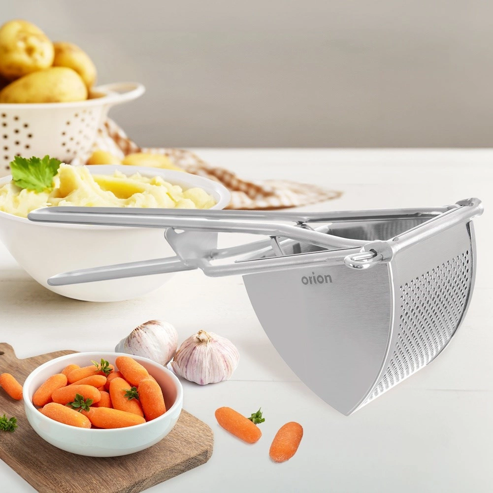 Praktická nerezová lis na brambory ORION zajistí hladké pyré bez hrudek a usnadní přípravu gnocchi, knedlíků a bramborové kaše. Díky pevné nerezové konstrukci a dlouhým pákovým rukojetím vyvine dostatečný tlak bez námahy. Snadno se čistí a je ideální pro brambory, zeleninu i ovoce.