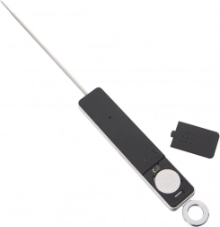 Odolné provedení kombinuje nerezovou ocel a pevné plastové tělo v černé barvě. Praktická ochranná krytka sondy usnadňuje bezpečné uložení a cestování, očko umožňuje zavěšení v kuchyni. Napájení zajišťuje 1× baterie CR2032 (není součástí balení).