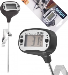 Praktický digitální teploměr s dlouhou vpichovací sondou z nerezové oceli pro přesné měření teploty masa, tekutin i omáček. Nabízí rozpětí od -45 °C do +200 °C (také +50 °F až +392 °F), přehledný LCD displej, přepínání °C/°F a klips pro uchycení k nádobě. Kompaktní provedení 17 cm, ideální pro vaření, pečení, smažení i grilování.