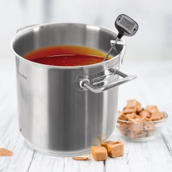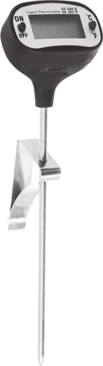 Odolná nerezová sonda zajistí přesné měření uvnitř pokrmu. Praktický klips udrží teploměr na okraji nádoby bez držení v ruce.