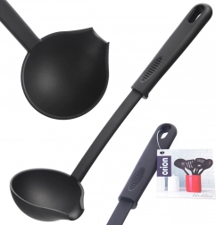 Praktická kuchyňská naběračka o objemu 60 ml a délce 29 cm z odolného termoplastu v elegantní černé barvě. Díky bočnímu výlevce umožňuje přesné servírování polévek, omáček i gulášů bez rozlití. Je lehounká, pohodlně se drží, má otvor pro zavěšení a je vhodná do myčky. Tepelná odolnost až 200 °C a nadčasový design řady BLACKLINE.
