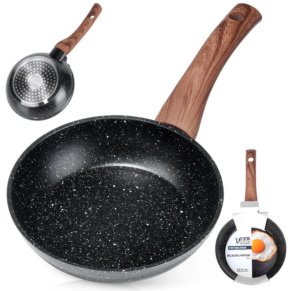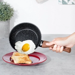 Tato univerzální pánev z hliníkového odlitku s granitovou nepřilnavou vrstvou je ideální pro smažení i dušení menších porcí – vajíček, zeleniny či masa. Stylové provedení v černé barvě s dřevěným vzhledem rukojeti skvěle zapadne do moderní kuchyně a usnadní každodenní přípravu pokrmů.