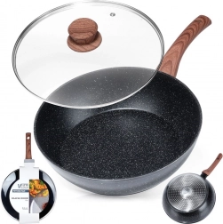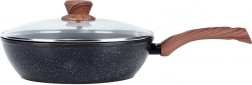 Tato hluboká hliníková pánev s granitovou nepřilnavou vrstvou je ideální pro každodenní vaření: smažení, restování i dušení. Elegantní kombinace černé barvy a dřevěného vzhledu skvěle zapadne do moderní kuchyně, zatímco skleněná poklice umožní kontrolu nad pokrmem a udrží teplo i vlhkost.