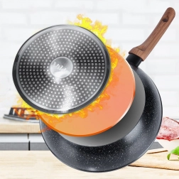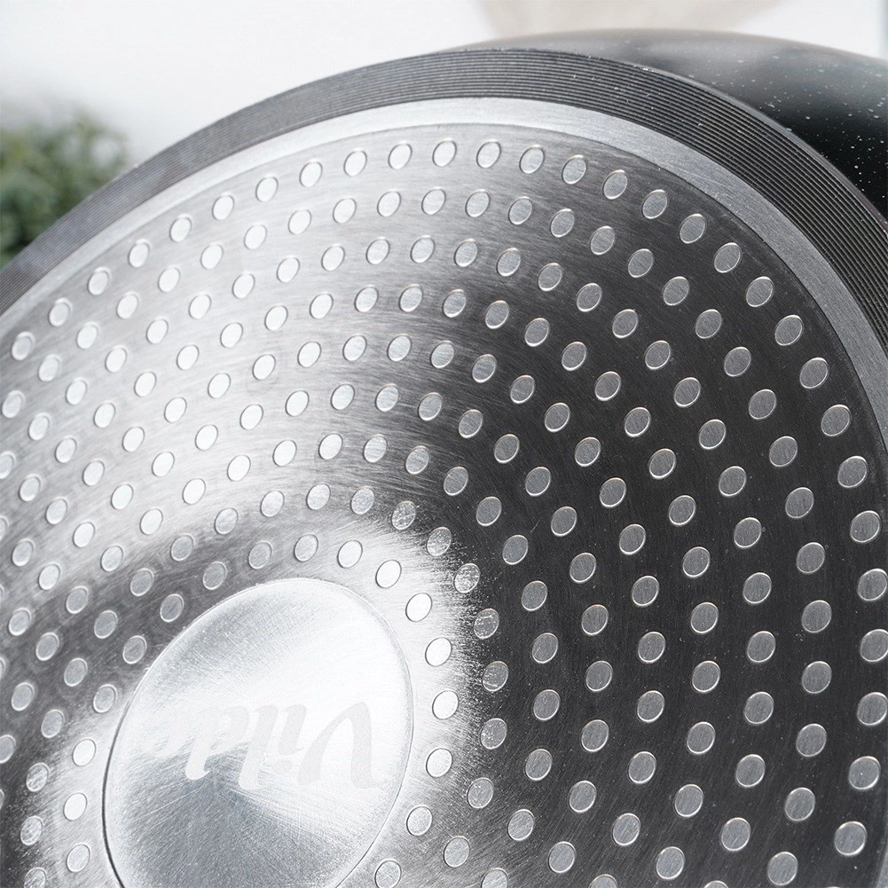 Masivní hliníkový odlitek zajišťuje rychlé a rovnoměrné zahřívání, což šetří čas i energii. Nepřilnavý granitový povrch minimalizuje připalování a usnadňuje čištění. Ergonomická rukojeť s protiskluzovou úpravou se při vaření nezahřívá a otvor na konci usnadňuje zavěšení.
