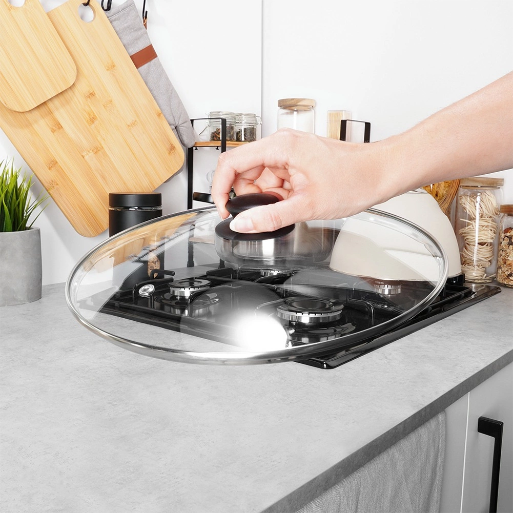 Robustní nerezová obruba chrání okraj skla a zajišťuje těsné dosednutí. Ergonomický knoflík se pohodlně drží i při každodenním používání.