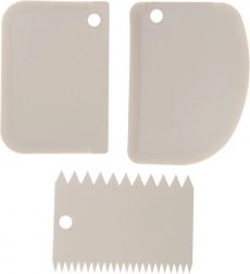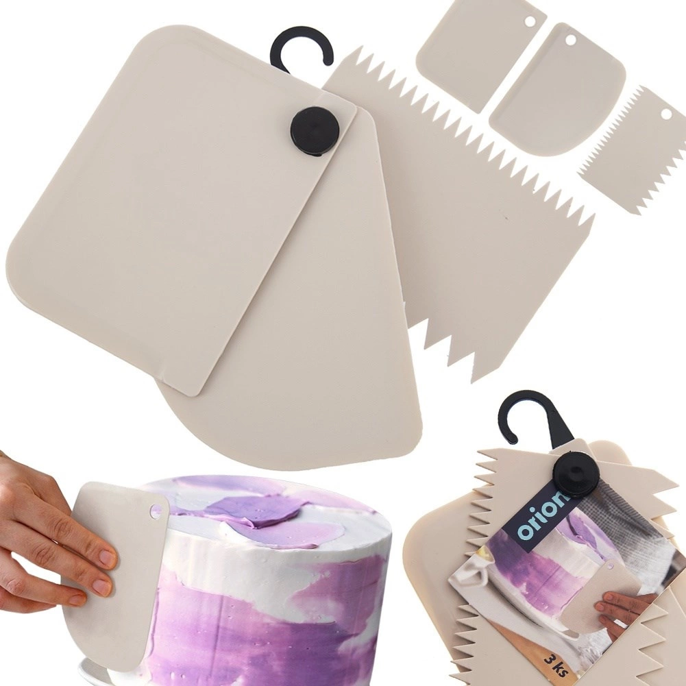 Praktická sada tří cukrářských špachtlí pro hladké i strukturované zdobení dortů a dezertů. Obsahuje hladké i zoubkované hrany pro profesionální vyhlazení krémů, tvorbu dekorativních vzorů a snadné roztírání polev. Lehký, odolný materiál v béžové barvě, vhodné do myčky a kompaktně spojené kroužkem pro pohodlné skladování.