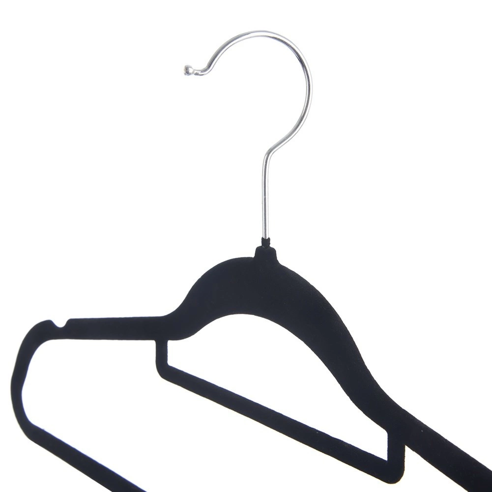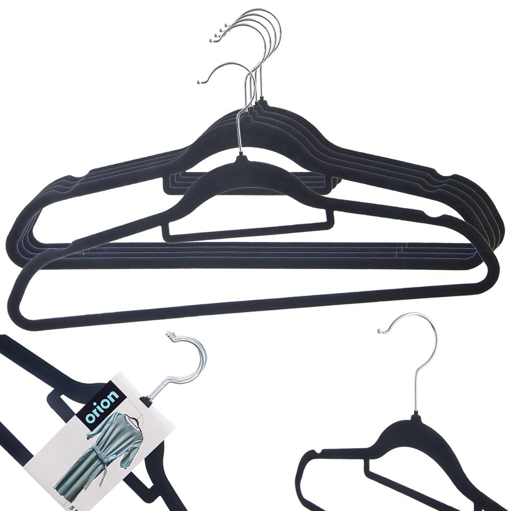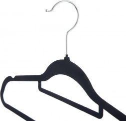 Praktická sada 5 černých velurových věšáků s antiskluzovým povrchem a otočným kovovým háčkem pro perfektní organizaci šatníku. Štíhlý profil šetří místo, ramínka mají zářezy na ramínka/blůzky a spodní tyč pro kalhoty či šátky. Rozměry jednoho kusu 45 × 23,5 × 0,5 cm – ideální do domácnosti i prodejen.