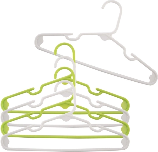 Lehký plast v bílé a zelené barvě se nedeformuje a ramínka lze snadno stohovat pro úsporu místa.