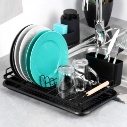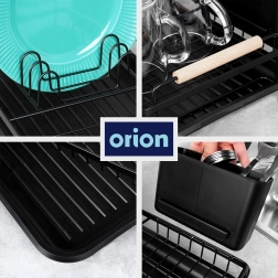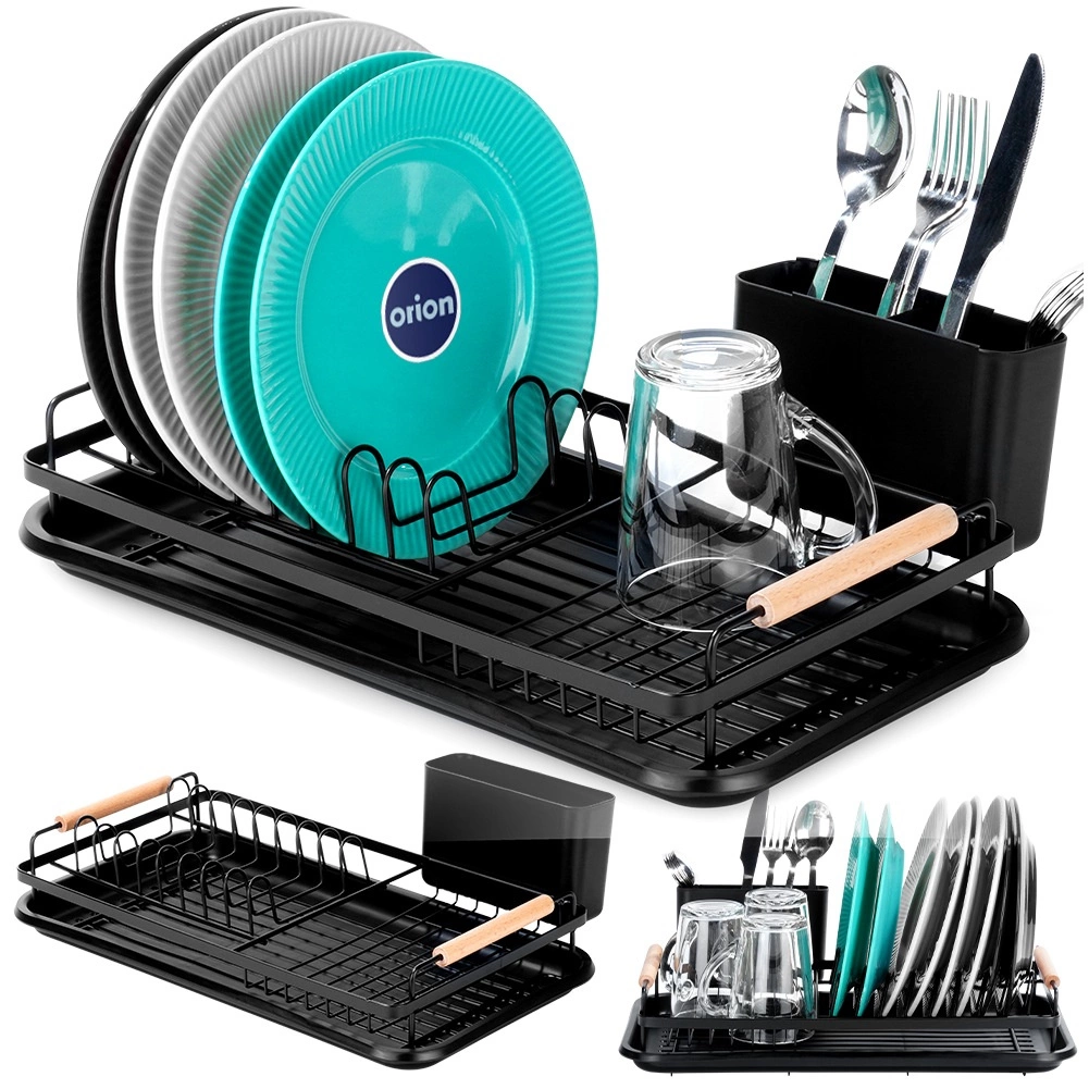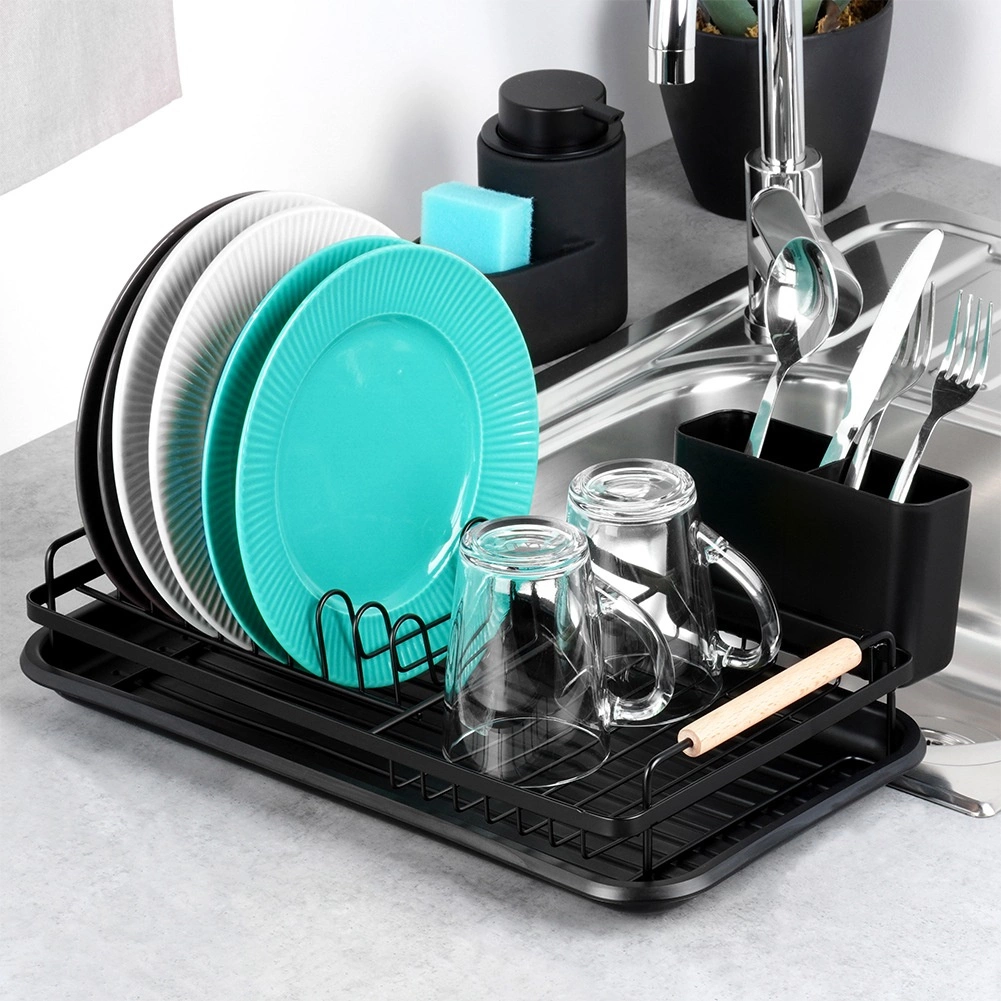 Stylový a kompaktní odkapávač na nádobí s rozměry 43 × 23,5 × 9,5 cm nabízí místo pro talíře, sklenice i příbory. Má vyjímatelnou odkapávací tácu, odnímatelný příborník a dřevěná madla pro snadné přenášení. Odolná kovová konstrukce v matné černé chrání pracovní desku před vodou a udržuje kuchyň v pořádku.