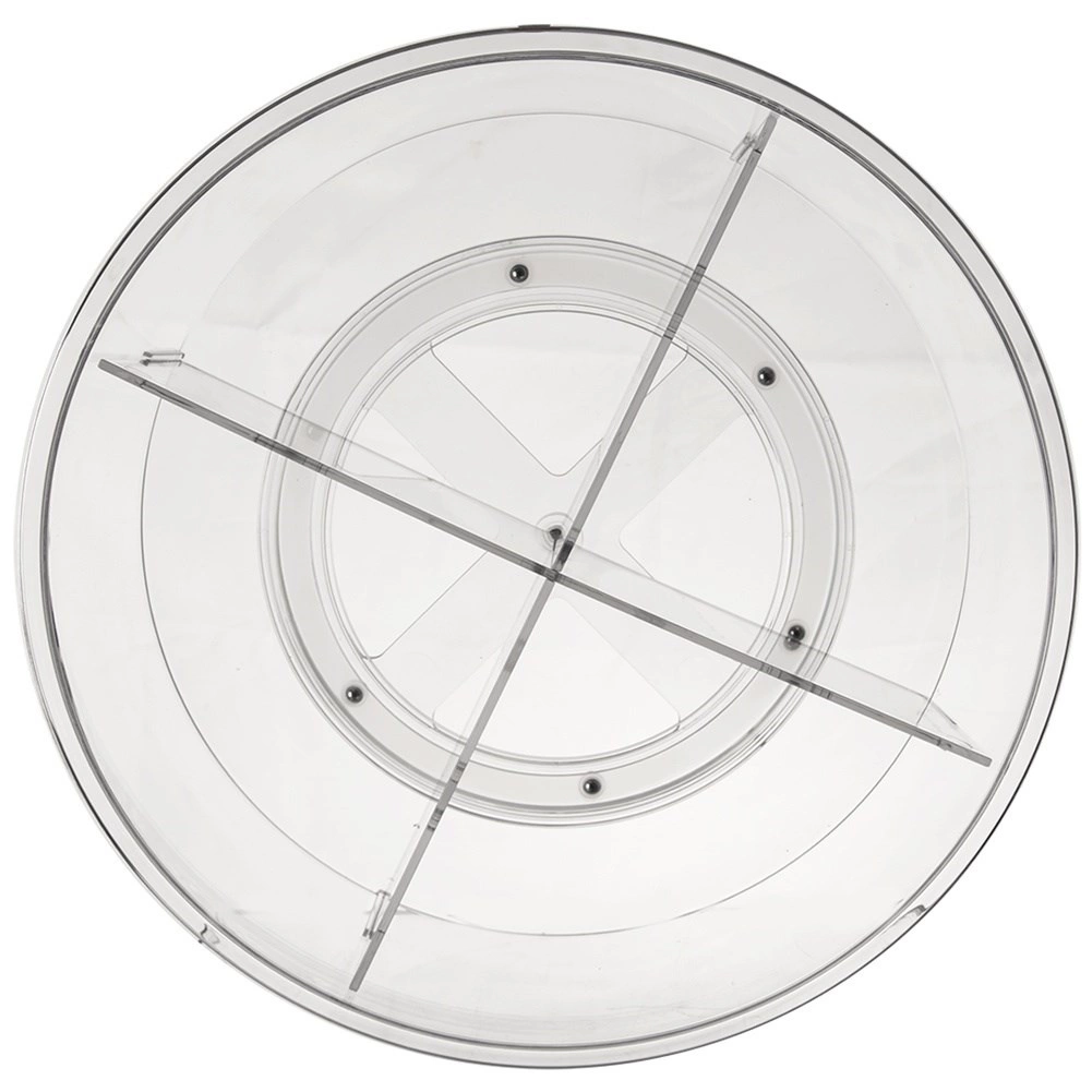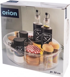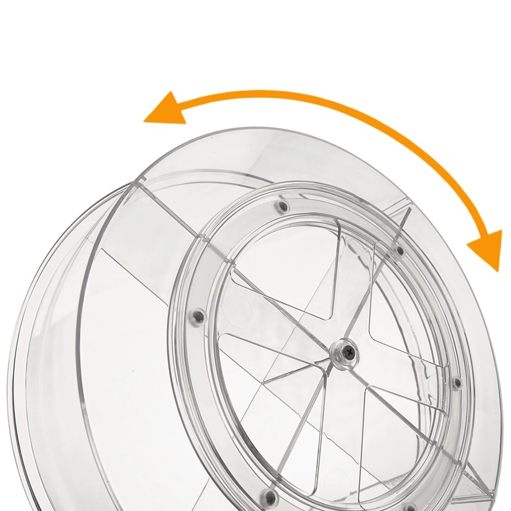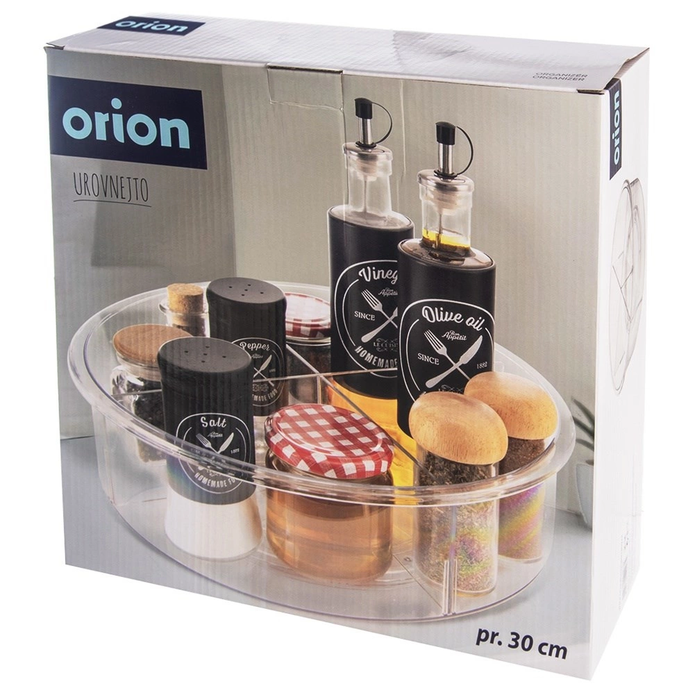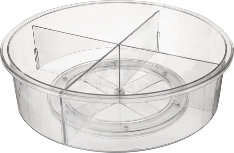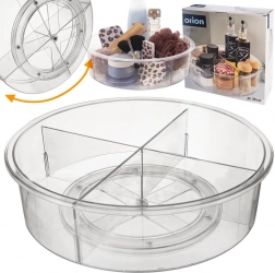 Praktický otočný organizér s průměrem 30 cm a výškou 9 cm přináší pořádek do kuchyně, koupelny i spíže. Díky podstavě s hladkým chodem se otáčí o 360°, takže máte vše rychle po ruce. Průhledné provedení a 4 oddělené sekce usnadňují přehledné třídění koření, kosmetiky, lahví i sklenic, zatímco vyšší okraje brání vypadávání při otáčení.
