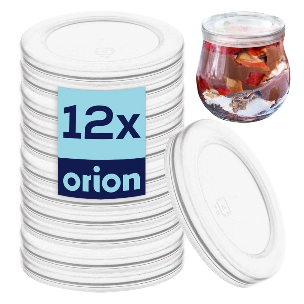Praktická sada 12 průhledných plastových víček o průměru 5,5 cm pro jogurtové a dezertní skleničky 130 ml. Víčka zajišťují těsné uzavření, udržují čerstvost a chrání obsah při skladování i přepravě. Vyrobeno z odolného materiálu pro opakované použití. Ověřená kvalita značky ORION.