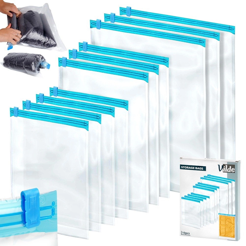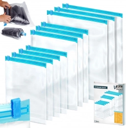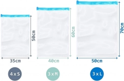 Sada obsahuje 10 odolných kompresních pytlů se spolehlivým jezdcovým zipem pro opakované použití. Díky třem velikostem snadno uskladníte trička, svetry, bundy i doplňky, a to jak v kufru na cesty, tak ve skříni doma. Transparentní materiál umožňuje rychlou kontrolu obsahu bez otevírání.