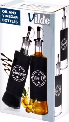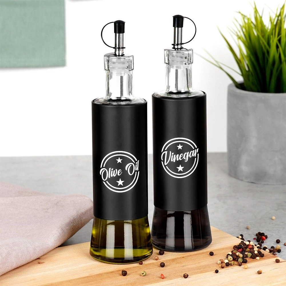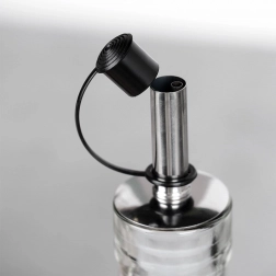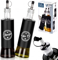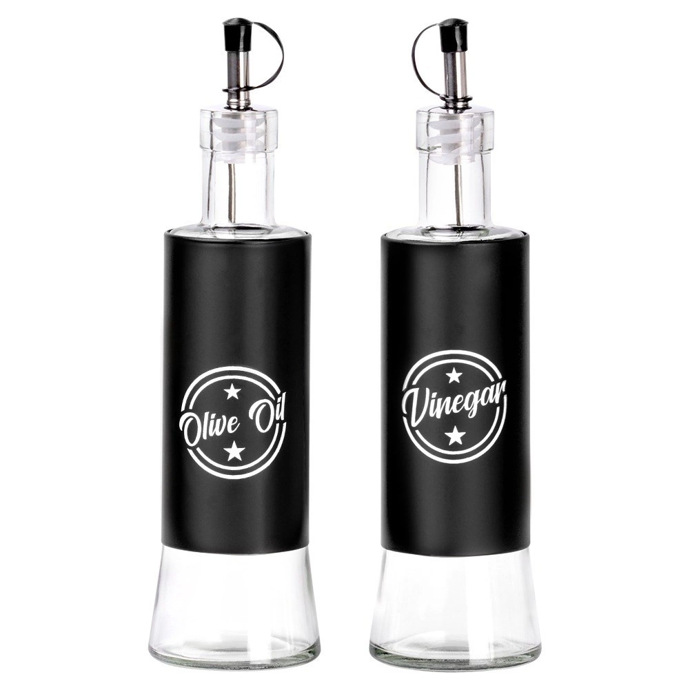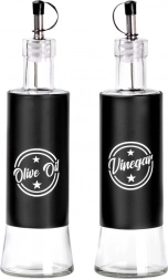 Tyto stylové dávkovače kombinují kvalitní čiré sklo a černý plášť pro odolnost a jistý úchop. Kovová nalévací hubice se zátkou zajišťuje kontrolovaný, bezkapkový tok a delší čerstvost obsahu. Díky výrazným nápisům Olive Oil a Vinegar vždy sáhnete po správné lahvi.