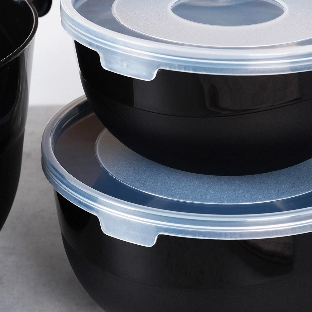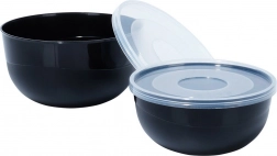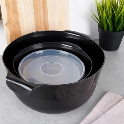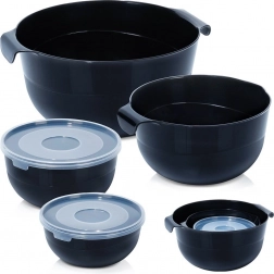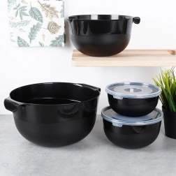S touto 6dílnou sadou získáte čtyři odolné mísy v moderní černé barvě a dvě průhledná víčka pro snadné skladování. Menší mísy s víčky jsou ideální na uchování připravených surovin v lednici, větší mísy s držadly a výlevkami zase zjednoduší míchání těst, šlehání i nalévání těsta na palačinky.