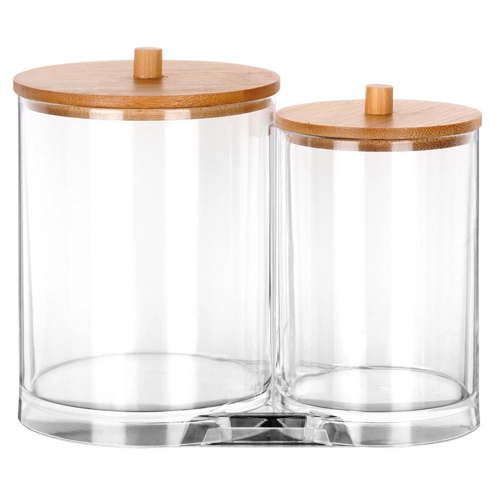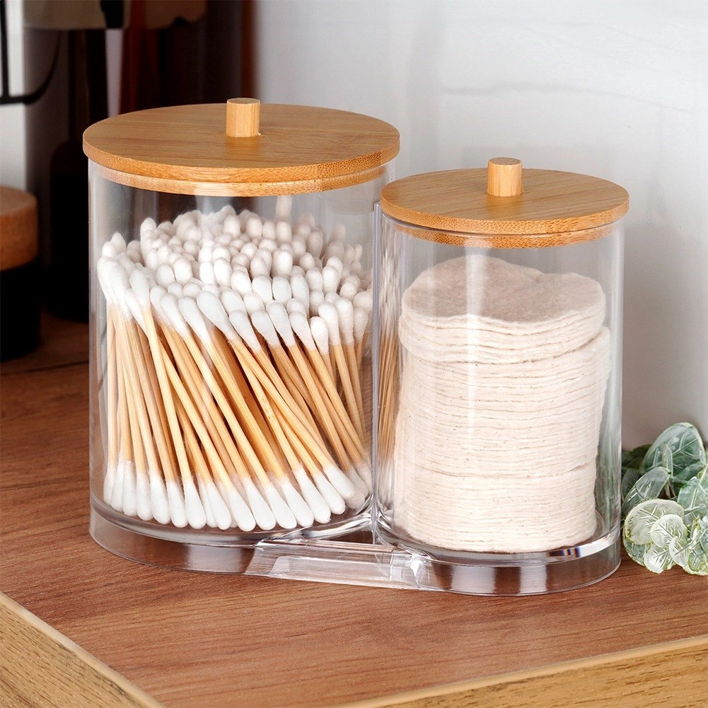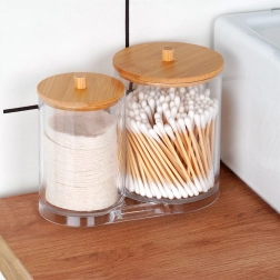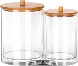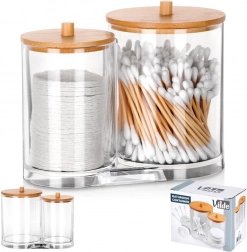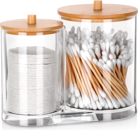 Praktický dvojitý organizér z čirého akrylu udrží vaše vatové tyčinky a odličovací tamponky vždy po ruce a hygienicky uložené. Díky bambusovým víčkům s pohodlnými úchyty zůstává obsah bez prachu, průhledné stěny zase umožní rychlou kontrolu zásob. Kompaktní rozměry 15 × 9 × 12,5 cm šetří místo a zajišťují přehledné uspořádání na poličce i na umyvadlové desce.