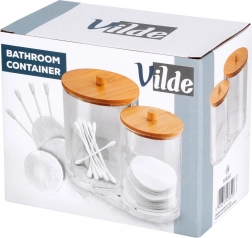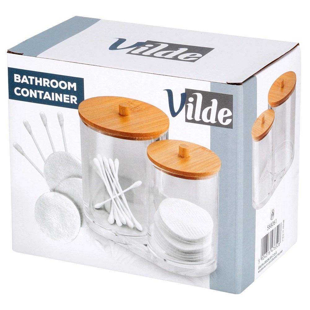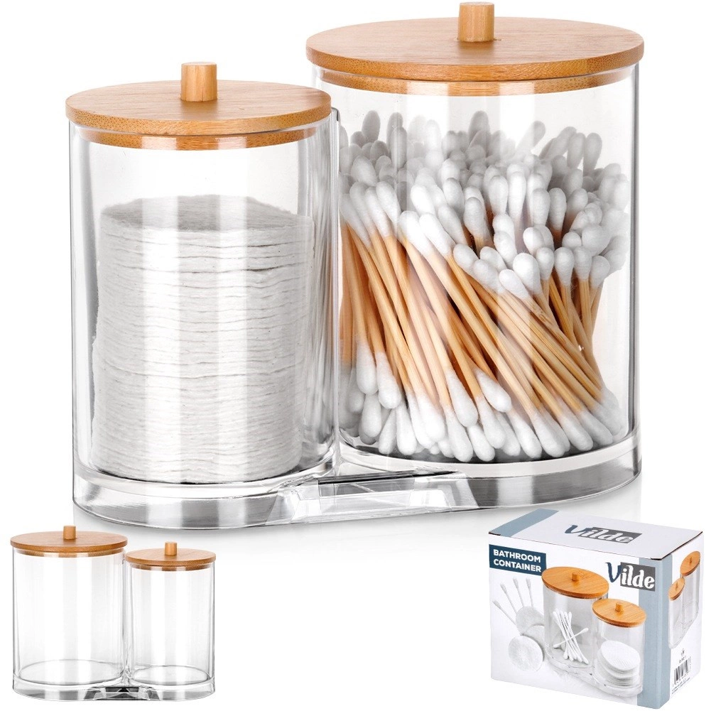 Elegantní a funkční řešení pro každodenní rutinu v koupelně. Dva propojené zásobníky z odolného čirého akrylu poskytují samostatný prostor pro vatové tyčinky a odličovací tamponky, takže vše zůstává čisté, dostupné a krásně uspořádané. Bambusová víčka s praktickými úchyty chrání obsah před prachem a dodávají přírodní, moderní vzhled.