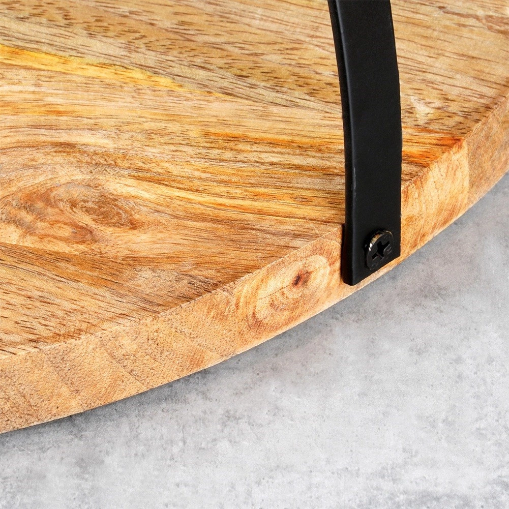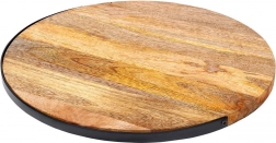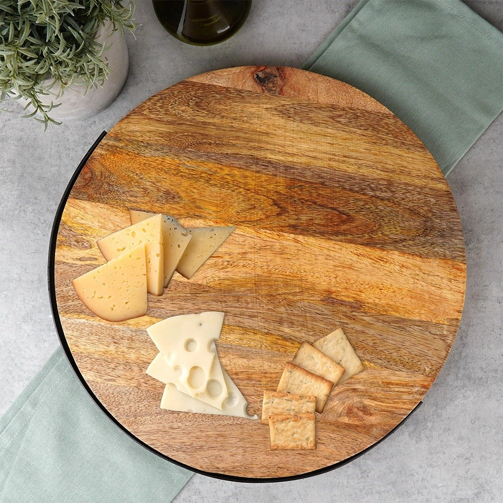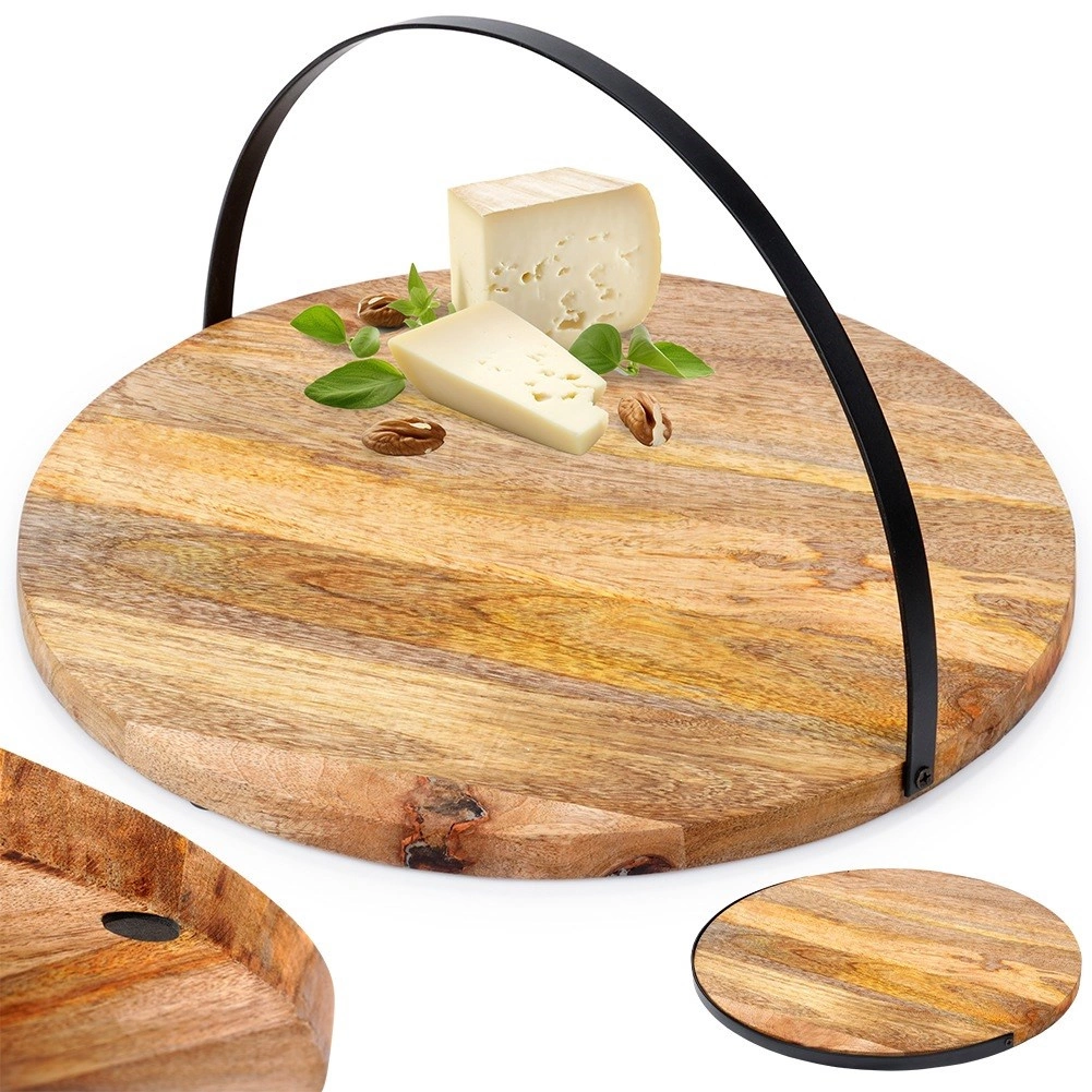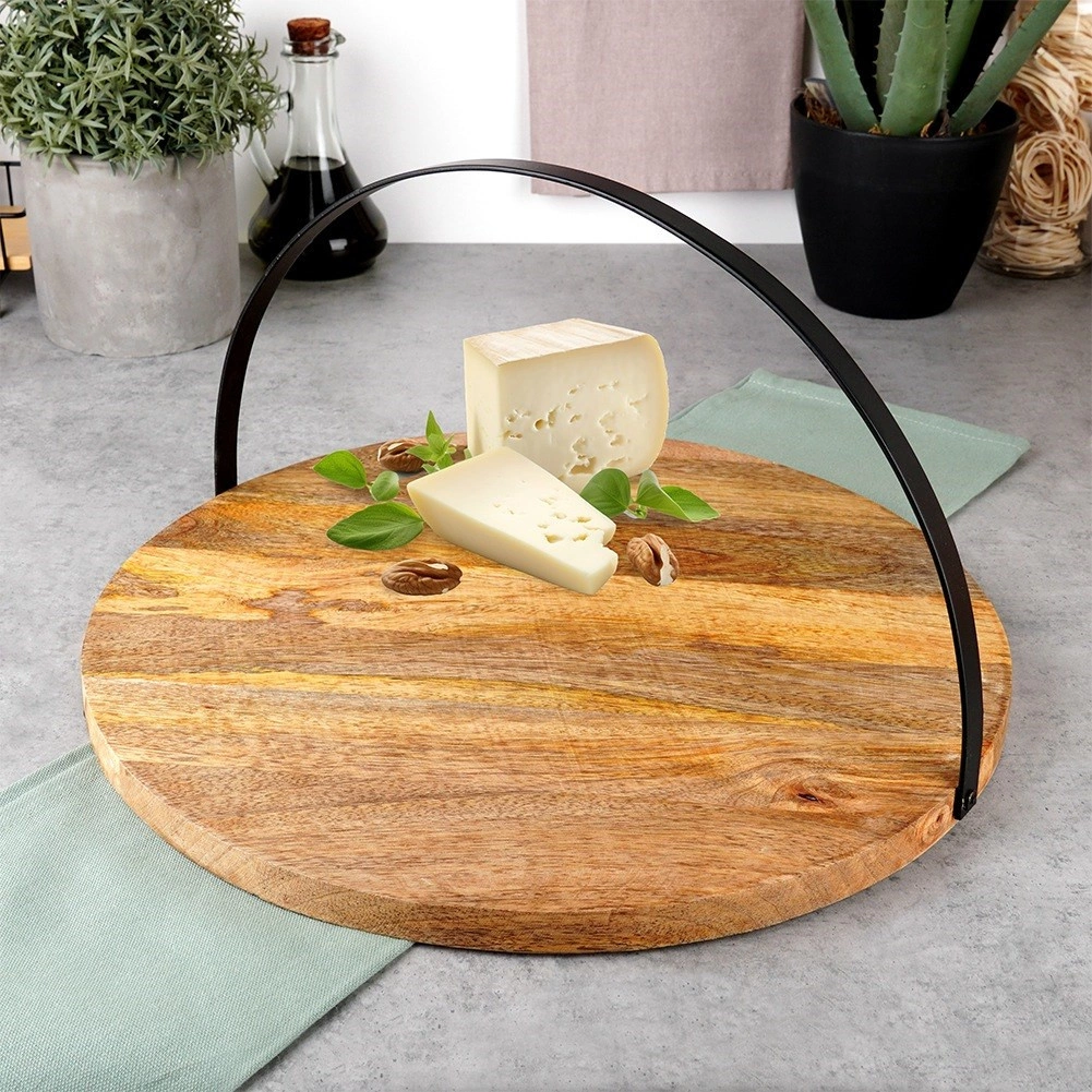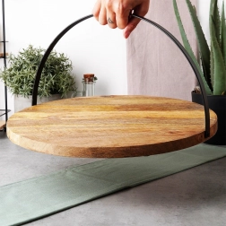 Stylová servírovací deska z mangového dřeva s praktickým sklopným kovovým držadlem pro snadné přenášení i zavěšení. Okrrouhlý tvar a průměr 38,5 cm nabízí dostatek místa pro sýry, uzeniny či dezerty. Odolné mangové dřevo lépe snáší vlhkost, nedeformuje se a rychle schne. Deska je vybavena protiskluzovými filcovými podložkami pro stabilitu a bezpečné použití jak doma, tak v gastronomii.