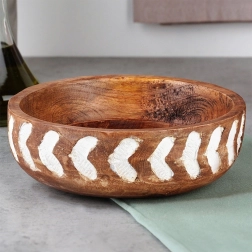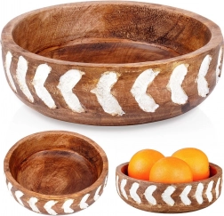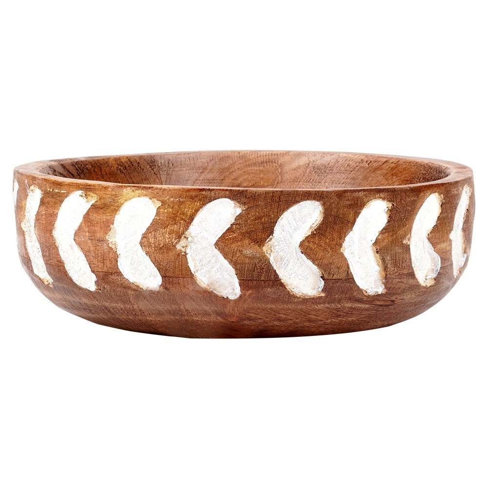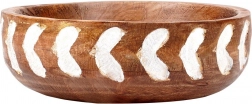 Tato miska z kvalitního mangového dřeva krásně doplní váš stůl i interiér. Široký a mělký profil usnadňuje servírování salátů, ovoce, oříšků či drobných pochutin. Ručně malovaný a vyřezávaný bílý vzor na vnějším okraji podtrhuje přirozenou kresbu dřeva a dává misce jedinečný, rustikální charakter.