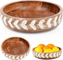 Stylová dřevěná miska z mangového dřeva s průměrem 24 cm a objemem 1,3 l je ideální pro servírování salátů, snacků i ovoce. Ozdobná, ručně vyřezávaná bílá chevron dekor přidává misce rustikální šarm a originální vzhled. Mangové dřevo je odolné vůči vlhkosti, rychle schne a nedeformuje se, což zaručuje dlouhou životnost a každodenní pohodlné používání.