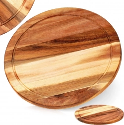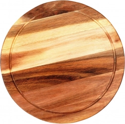 Kvalitní dřevěná deska z přírodního akáciového dřeva kombinuje funkčnost a estetiku. Kulatý tvar s hlubokým žlábkem zachytí šťávy a drobky, takže pracovní plocha zůstane čistá. Tloušťka 1,5 cm zajišťuje stabilitu a dlouhou životnost.