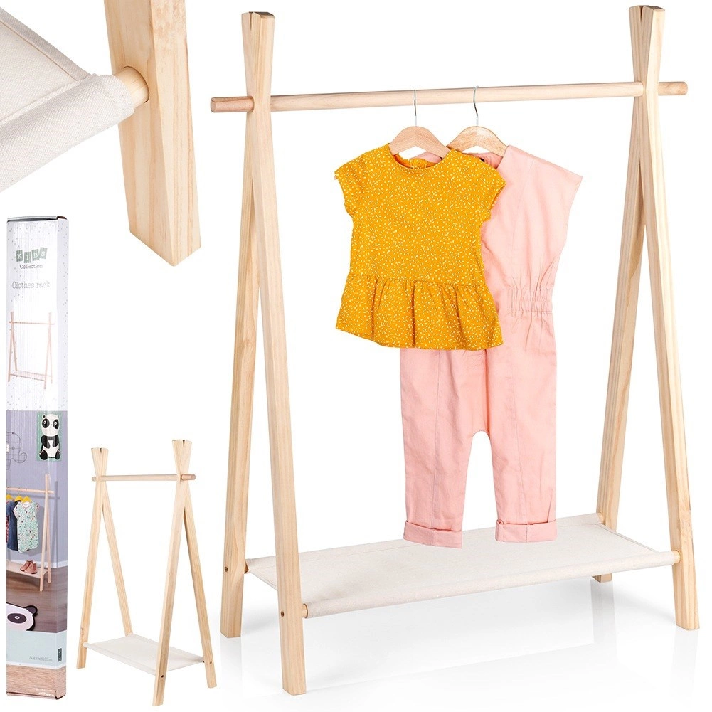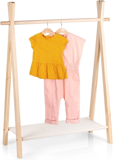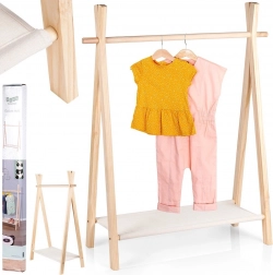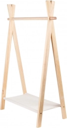 Tento stojanový věšák v designu tipi je navržen na míru dětem – je snadno dostupný, podporuje samostatnost a udržuje jejich oblečení přehledně na jednom místě. Přírodní borovicové dřevo vyniká nadčasovým skandinávským vzhledem, zatímco spodní lněná police poskytuje další prostor na boty, batůžky či hračky.