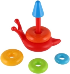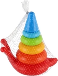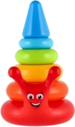 Barevná skládací pyramida je ideální hračkou pro rozvoj motorických dovedností dětí. Skládá se z několika barevných kruhů a usmívající se základny ve tvaru šneka.