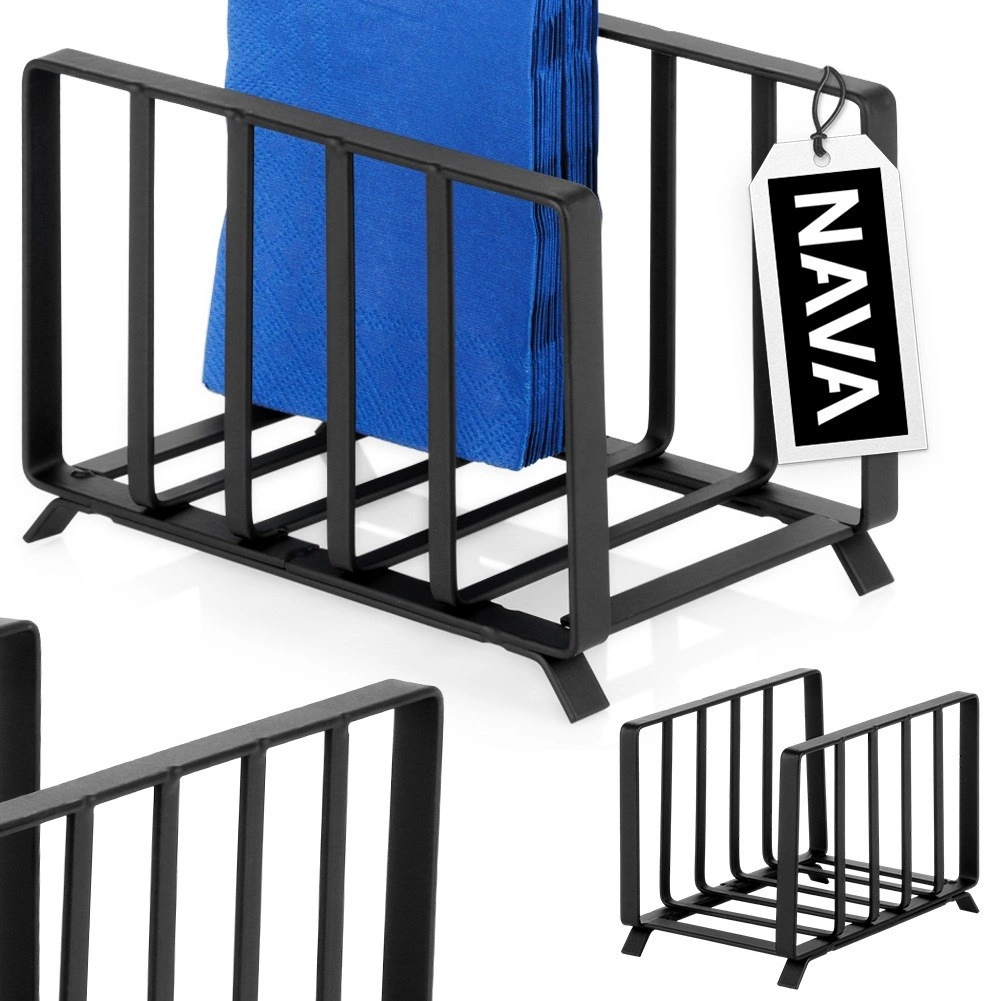 Elegantní a praktický kovový stojan na ubrousky v černé matné barvě udrží ubrousky vždy po ruce a na svém místě. Díky rozměrům 14,5 × 9,5 × 10,5 cm pojme velké množství ubrousků a hodí se do kuchyně, jídelny i na zahradu. Odolná celokovová konstrukce s práškovým lakem zajišťuje stabilitu a dlouhou životnost. Stylový doplněk v industriálním designu od značky NAVA.
