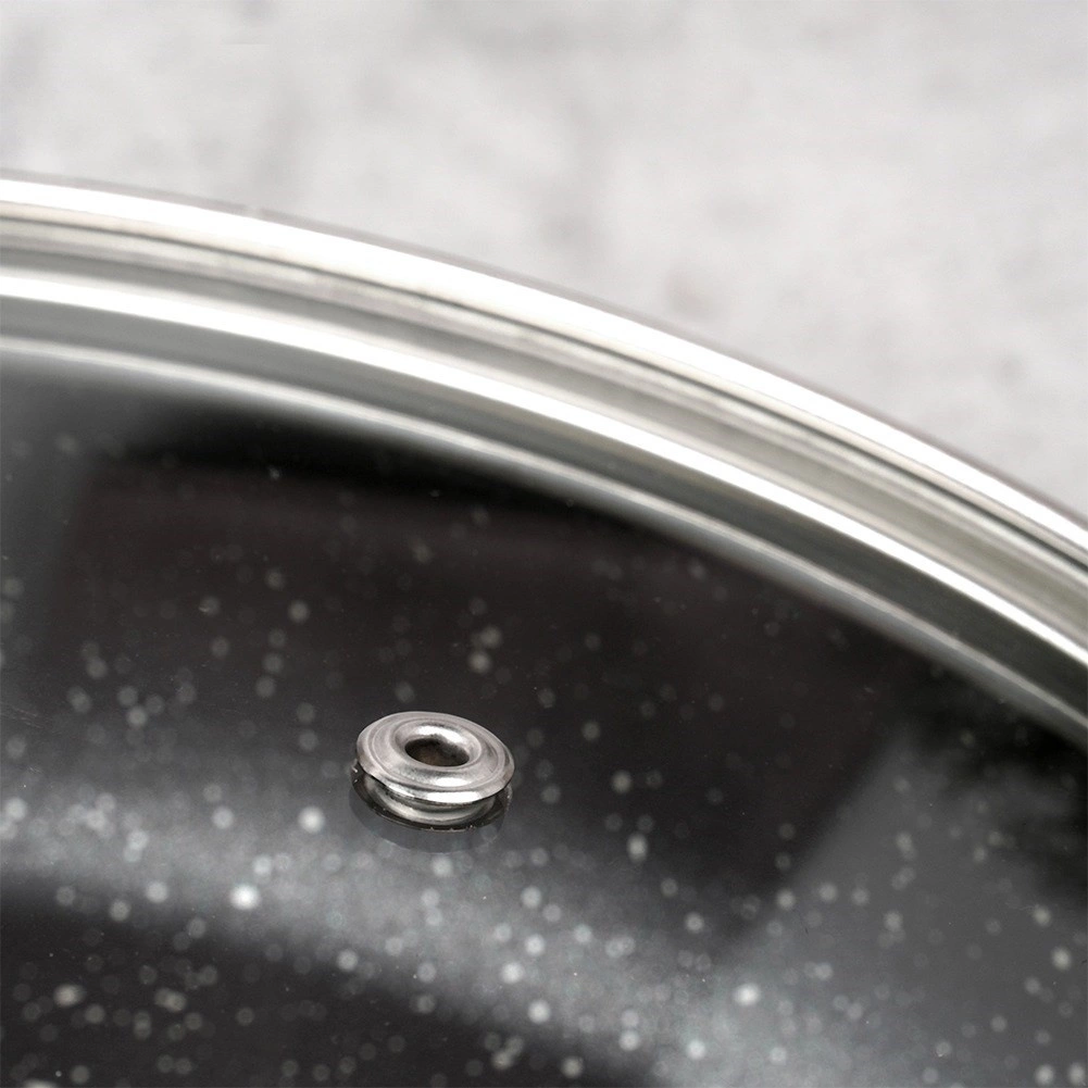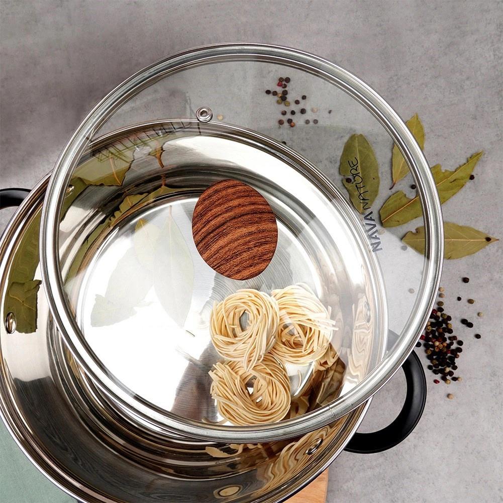 Robustní nerezová obruba zajišťuje dlouhou životnost a těsný dosed na okraj nádoby. Ergonomický knoflík s imitací dřeva je příjemný na dotek a bezpečný při manipulaci. Integrovaný odvětrávací otvor spolehlivě odvádí přebytečnou páru a mírně vypouklý tvar podporuje cirkulaci horkého vzduchu.