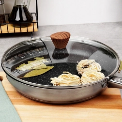 Univerzální skleněná poklice o průměru 26 cm se silnou nerezovou obručí a pohodlným úchopem v dekoru dřeva. Díky průhlednému sklu můžete kontrolovat vaření bez nadzvedávání, integrovaný odvzdušňovací otvor odvádí přebytečnou páru a vysoký okraj zajišťuje těsné dosednutí na hrnce a pánve. Vhodná do myčky, ideální pro rychlejší vaření a méně stříkání vody a tuku.