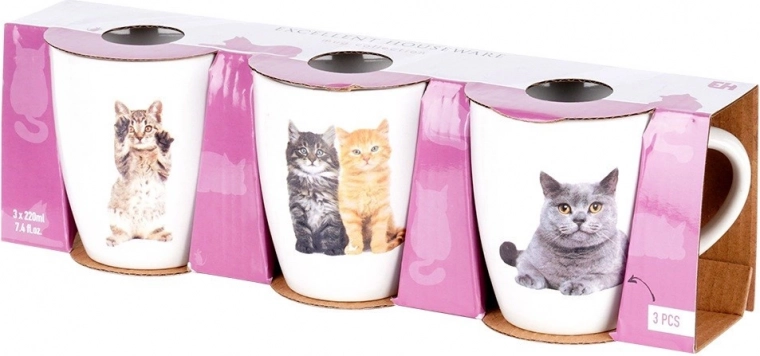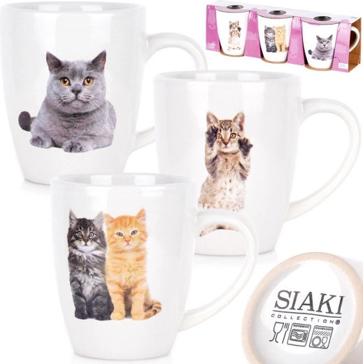 Objevte elegantní sadu 3 keramických hrnků s objemem 220 ml, které zaujmou realistickými potisky koček a lesklým bílým povrchem. Klasický tvar s velkým uchem zajišťuje pohodlné držení a příjemné každodenní používání.