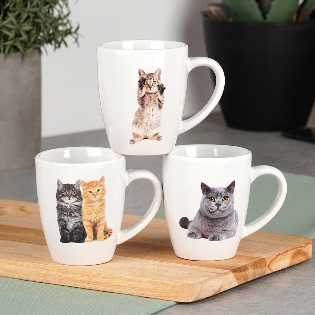 Každý hrnek zdobí realistický potisk kočky, který vynikne na lesklé bílé keramice a zútulní váš stůl.