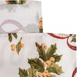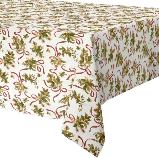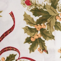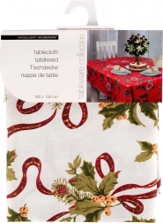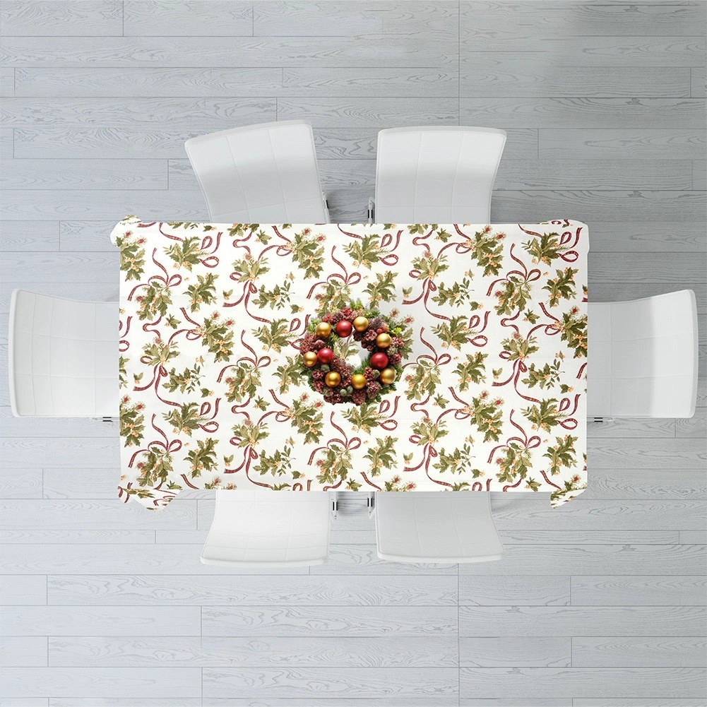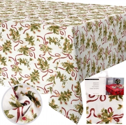 Stylový vánoční ubrus o rozměrech 180 × 130 cm v krémové barvě se vzorem zeleného cesmíny a červených stuh zkrášlí každý sváteční stůl. Díky materiálu z odolného polyesteru je nešpinivý, snadno se udržuje a chrání desku stolu před skvrnami a poškrábáním. Ideální pro vánoční večeře a sváteční setkání.