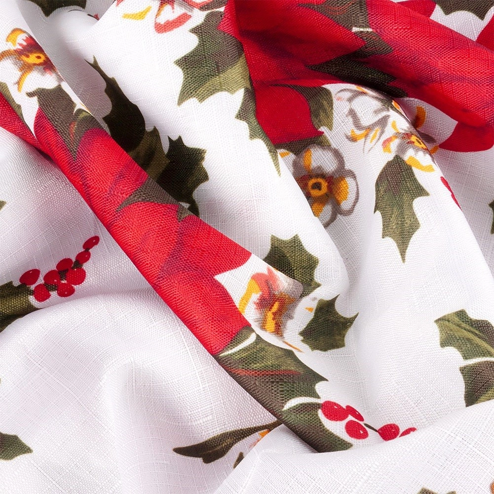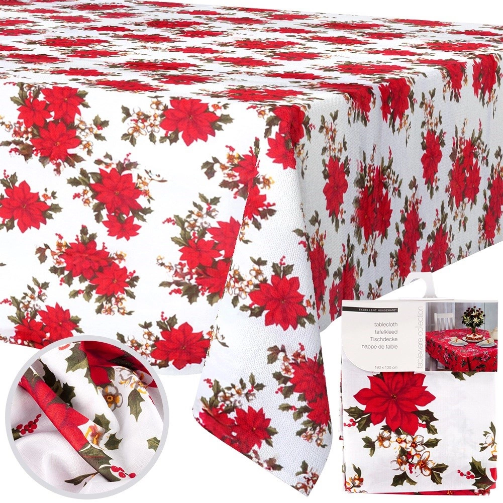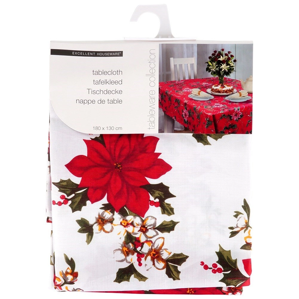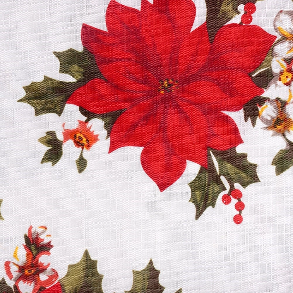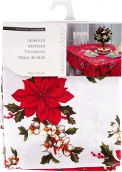 Stylový vánoční ubrus o rozměru 180 × 130 cm z odolného polyesteru chrání stůl a dodá mu sváteční atmosféru. Plamoodolná úprava usnadňuje čištění běžných skvrn, bílý podklad s červenými poinsettiemi a zelenými listy krásně vynikne při štědrovečerní večeři i zimních setkáních.