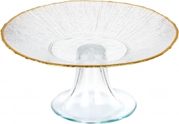 Tento stylový skleněný stojan na dort vyniká čistým designem, průhledným sklem a decentním zlatým okrajem, který podtrhuje slavnostní atmosféru. Vyvýšená konstrukce na nožce zajišťuje pohodlné krájení i servírování a zároveň dává dezertům vyniknout.