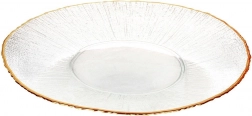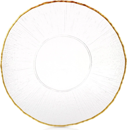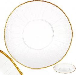 Tento univerzální skleněný talíř vyniká čistým vzhledem a dekorativním zlatým lemem, který dodá každé tabuli nádech luxusu. Transparentní sklo s jemným radiálním reliéfem krásně zvýrazní podávané pokrmy a hodí se jak do moderní, tak klasické výbavy.