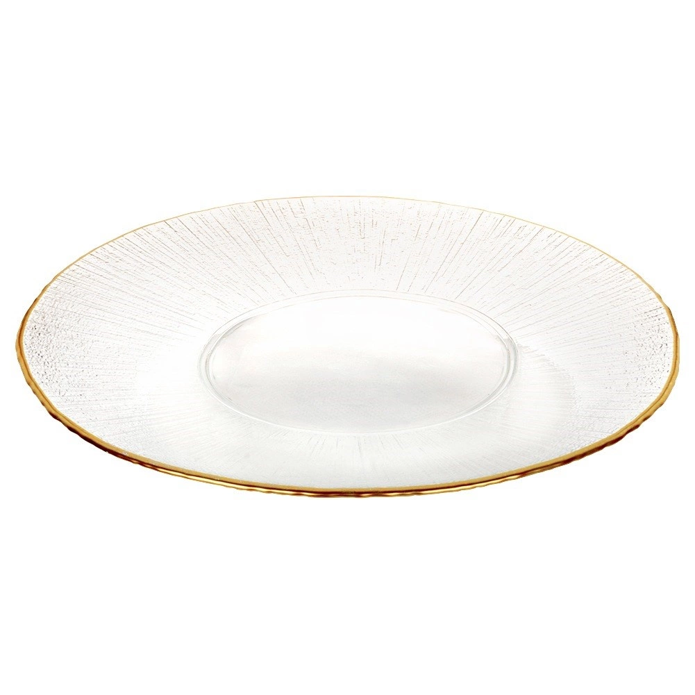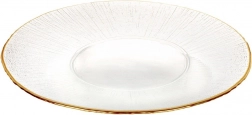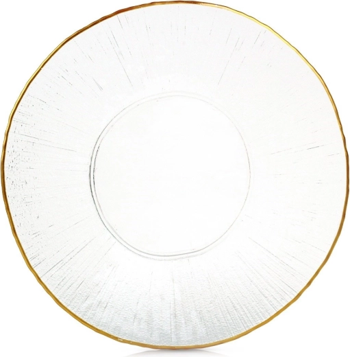 Elegantní skleněný talíř o průměru 30 cm se zlatým okrajem a jemnou texturou dodá vaší tabuli luxusní vzhled. Díky velkému rozměru poslouží nejen jako mělký talíř, ale také jako stylová patera na dorty, ovoce či předkrmy. Vyroben z kvalitního čirého skla, které napodobuje vzhled křišťálu.