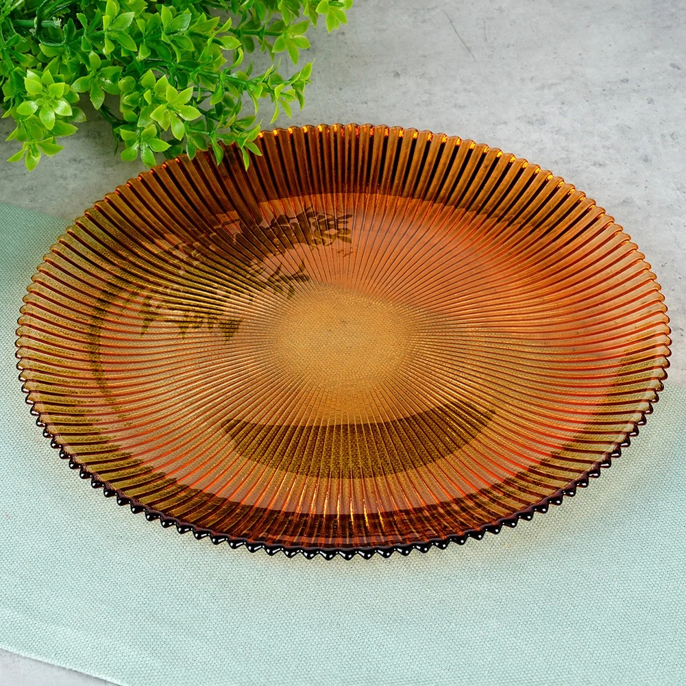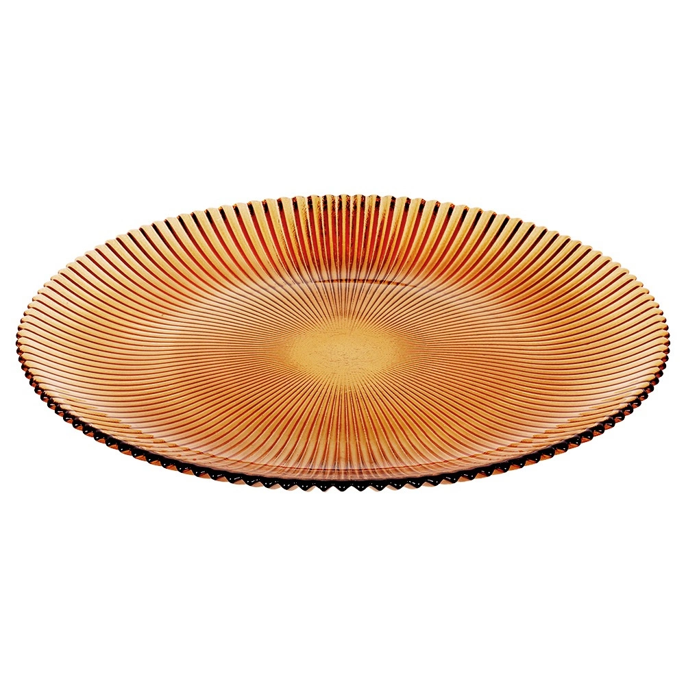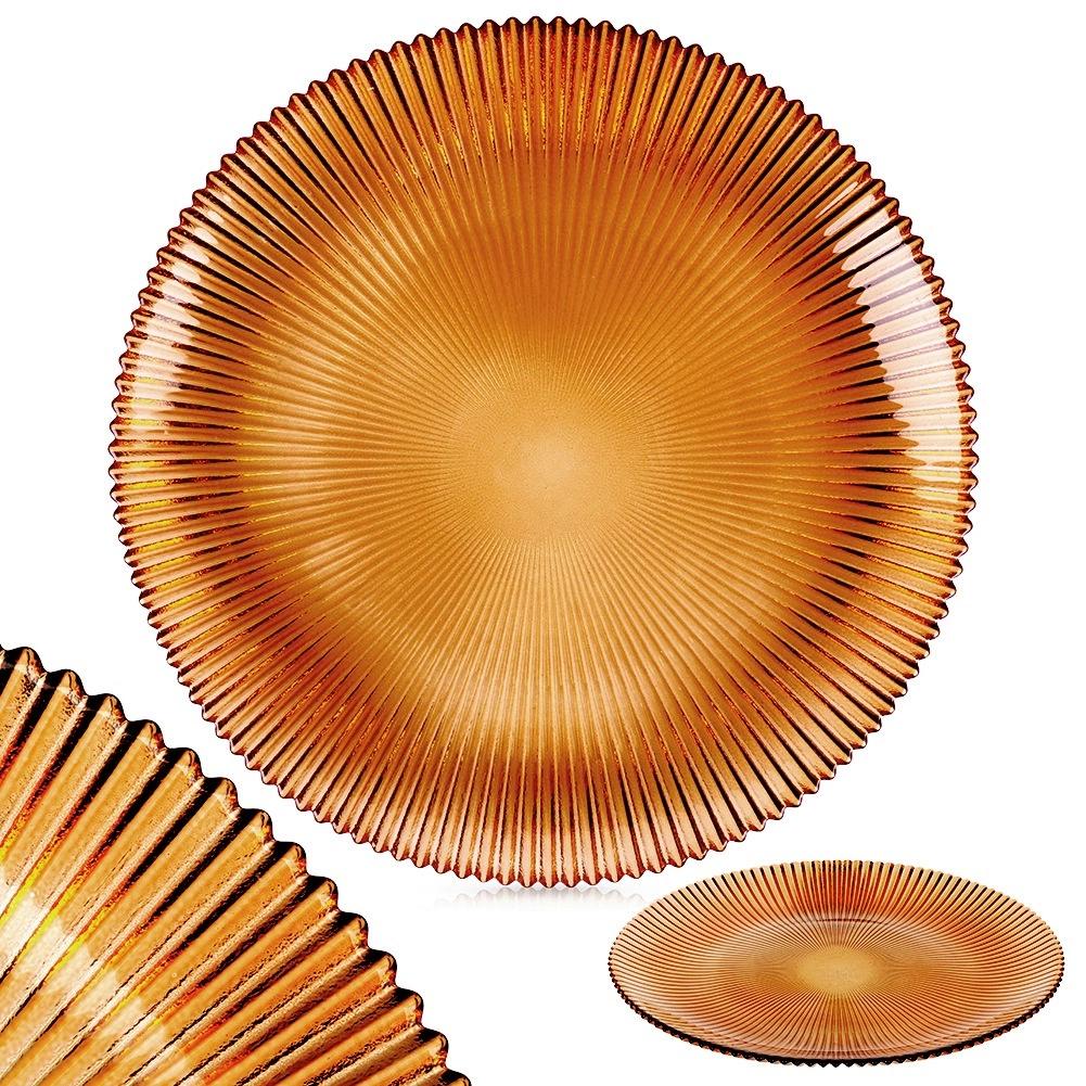 Vsaďte na nadčasovou eleganci: tento dezertní talíř z čirého skla v jantarové barvě vyniká reliéfním paprskovým vzorem a jemně zvlněným okrajem. Díky průměru 21 cm je perfektní na dorty, koláče, dezerty, ovoce i menší slané pokrmy.