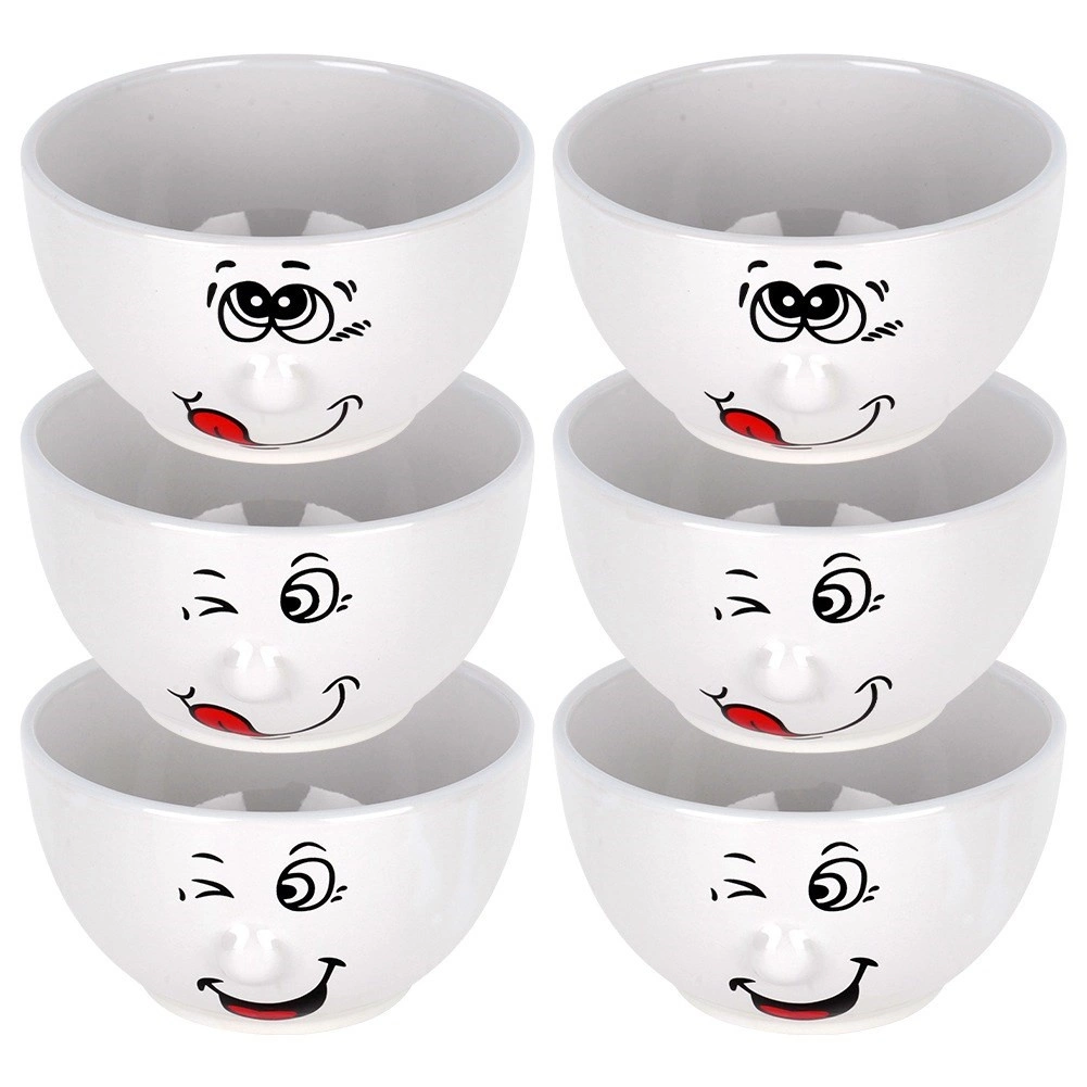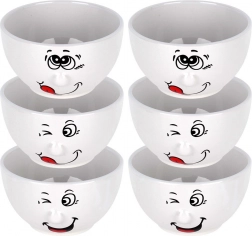 Praktická a stylová sada misek, které zaujmou humorným dekorem s obličeji a zároveň nabídnou univerzální využití pro každodenní servírování. Díky objemu 550 ml jsou ideální na polévky, krémy, müsli, saláty i drobné pochutiny. Lesklá bílá keramika vynikne v každé kuchyni a snadno se kombinuje s dalším nádobím.