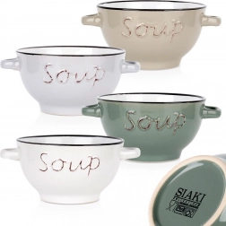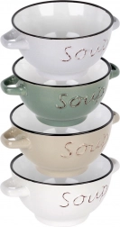 Každá miska má praktická boční ucha pro bezpečné přenášení. Kvalitní keramika dobře drží teplo a je nenáročná na údržbu – misky můžete mýt v myčce a ohřívat v mikrovlnné troubě. Mix čtyř neutrálních barev (bílá, béžová, šedá, zelená) se hodí do moderních i tradičních interiérů.
