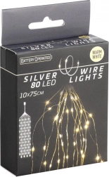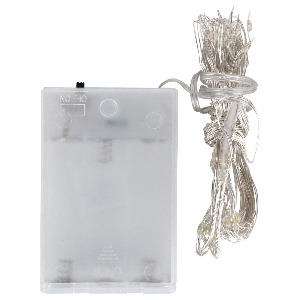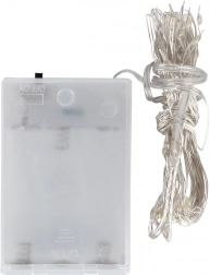 Opona se skládá z 10 drátěných pramenů, na každém je 8 LED s rozestupy cca 10 cm. Napájení zajišťuje kompaktní bateriový box (3× AA, nejsou součástí) s posuvným vypínačem, takže se obejdete bez zásuvky a kabelů – ideální pro flexibilní umístění na okno, stěnu či nábytek.