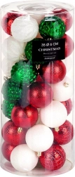 Praktické balení obsahuje 35 koulí o průměru 6 cm v červené, zelené a bílé barvě včetně šňůrek na zavěšení pro rychlou a snadnou dekoraci.