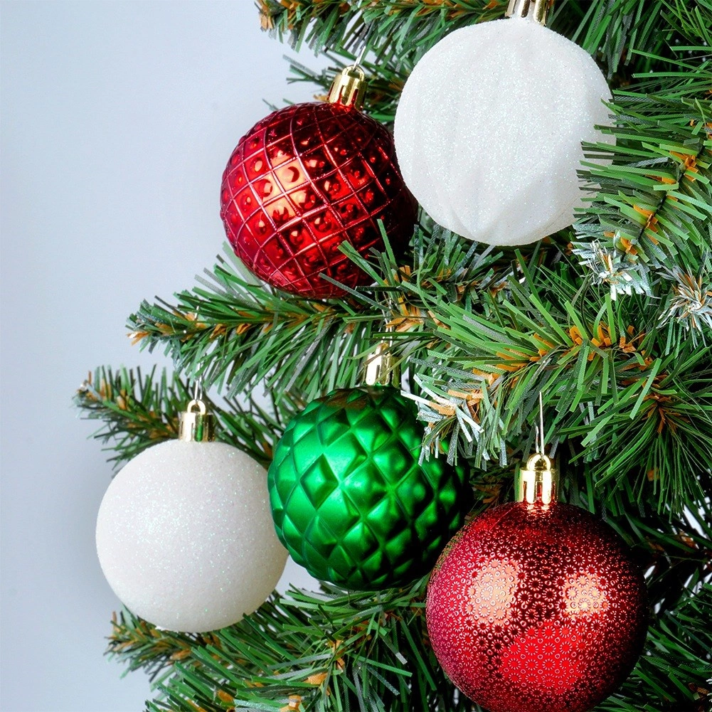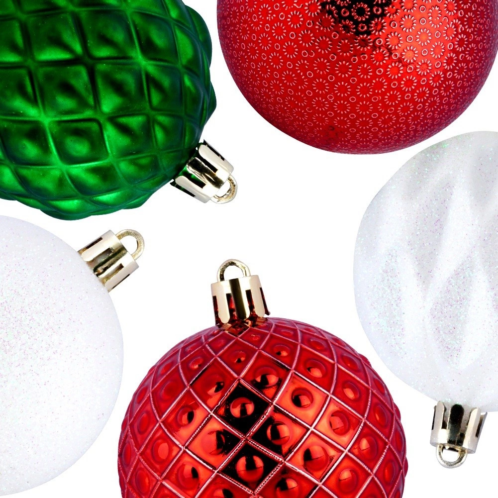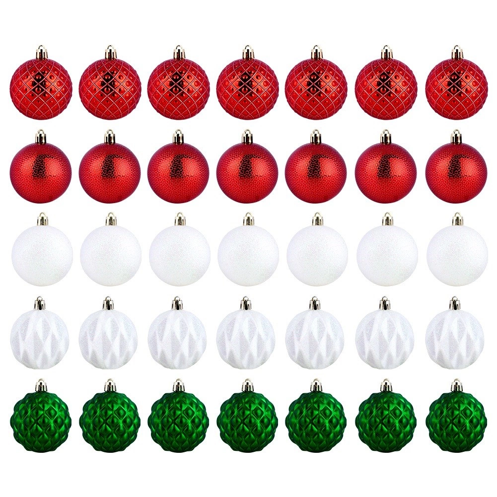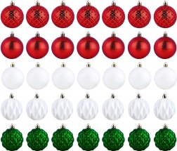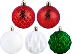 Elegantní sada 35 nerozbitných vánočních ozdob v barvách červená, zelená a bílá s různými povrchy – lesk, mat, třpyt, reliéf. Koule o průměru 6 cm bezpečně zkrášlí váš stromek, věnce i girlandy a vytvoří kouzelnou vánoční atmosféru. Součástí jsou šňůrky na zavěšení.