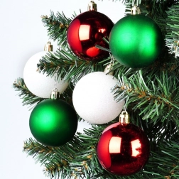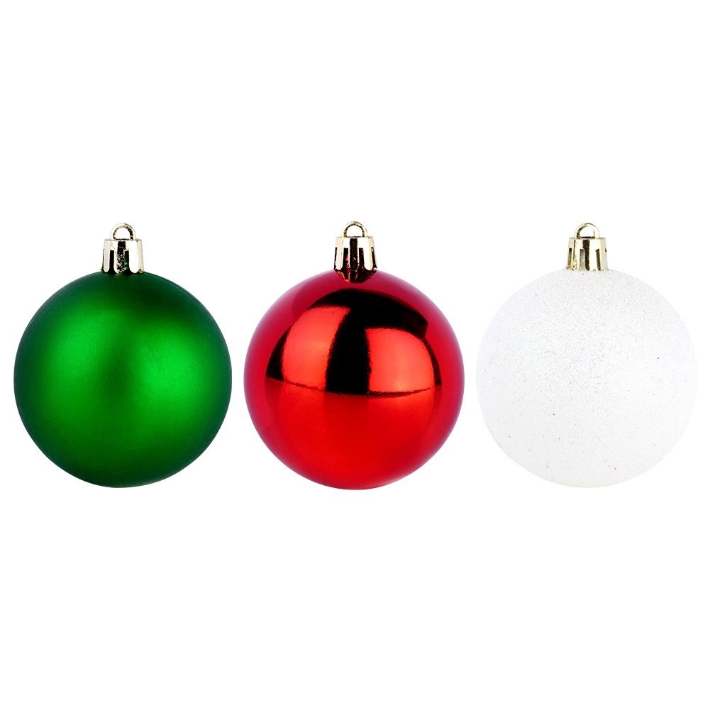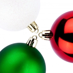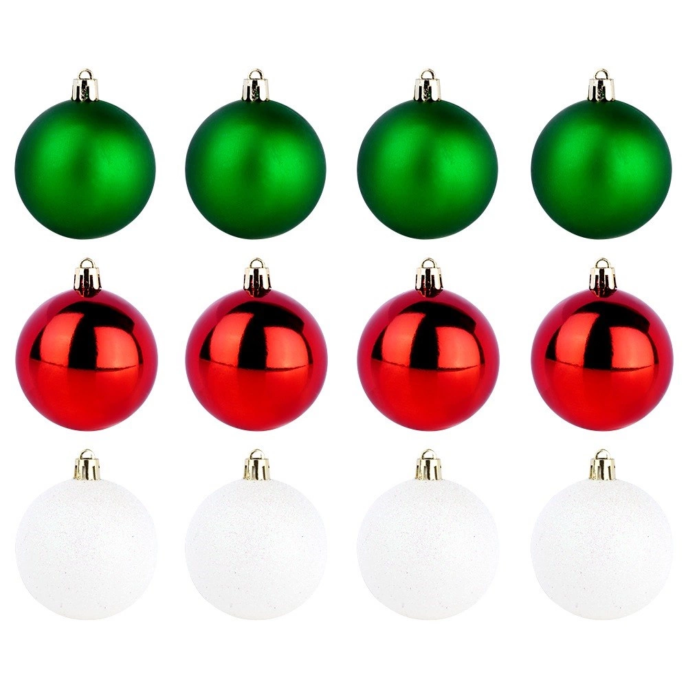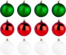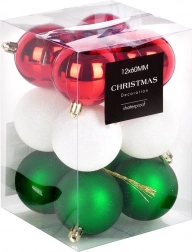 Stylová sada 12 kusů vánočních baněk v barvách červená, zelená a bílá o průměru 6 cm. Baňky jsou netříštitelné, mají lesklé, matné i třpytivé povrchy a díky odolnému plastu jsou bezpečné pro domácnosti s dětmi a mazlíčky. Ideální na vánoční stromek, věnce i girlandy pro vytvoření kouzelné sváteční atmosféry.
