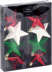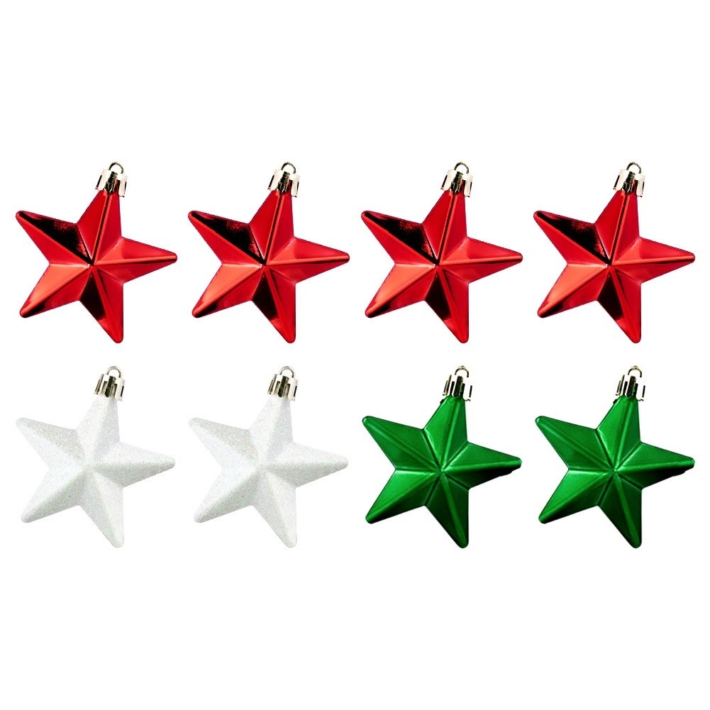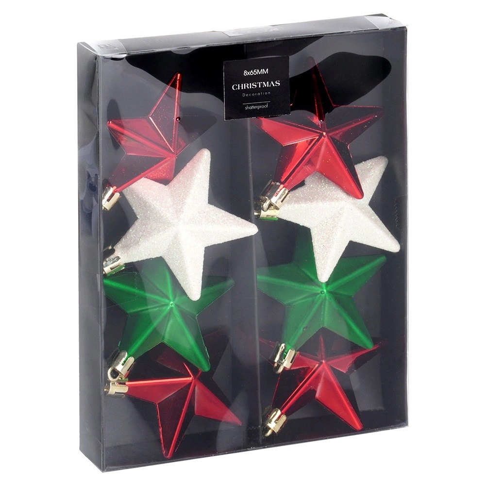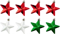 Stylová sada 8 nerozbitných vánočních ozdob ve tvaru hvězdy v barvách červená, zelená a bílá s lesklým, matným a třpytivým povrchem. Hvězdičky o průměru 6,5 cm dodají vaší výzdobě klasický lesk a bezpečnou eleganci – ideální do domácností s dětmi a mazlíčky.