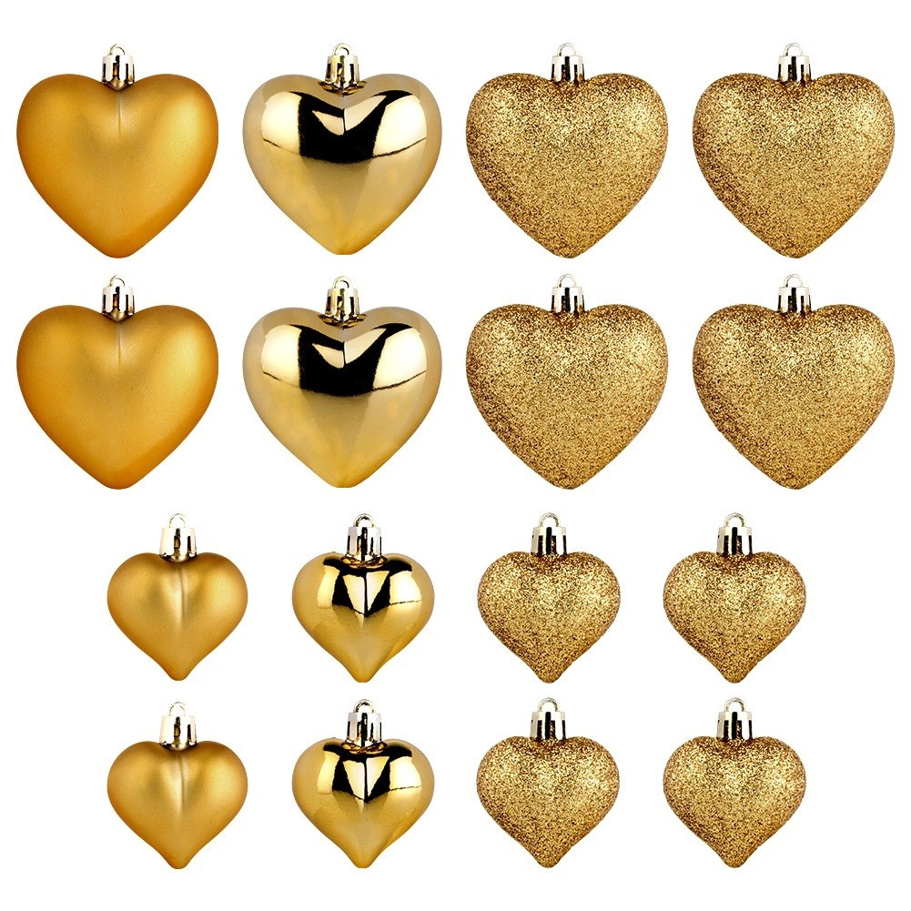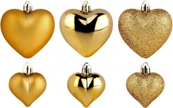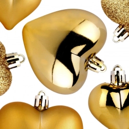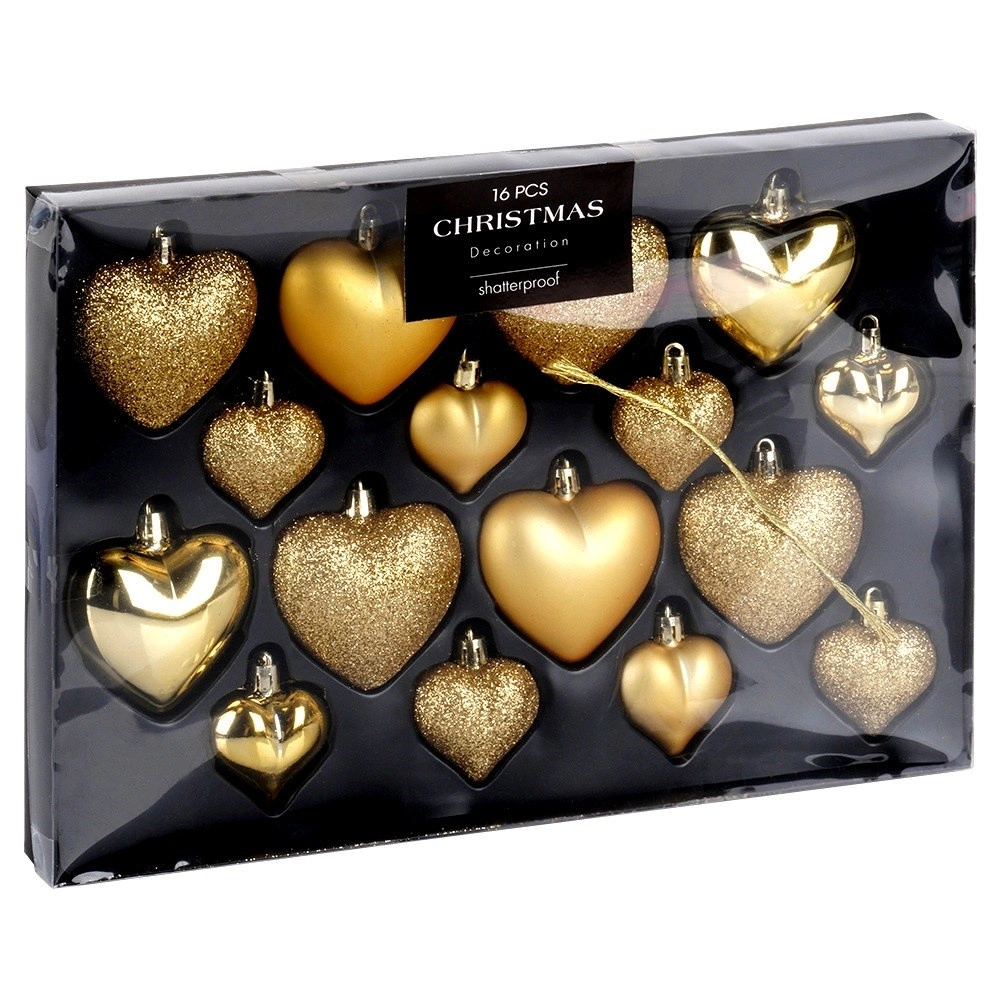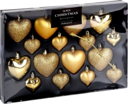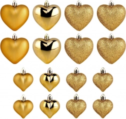 Elegantní sada 16 ks zlatých vánočních ozdob ve tvaru srdce v provedení mat, lesk a glitter. Díky nerozbitnému materiálu jsou bezpečné do domácností s dětmi i domácími mazlíčky. Dvě velikosti 6,5 cm a 4,5 cm umožní harmonickou výzdobu vánočního stromku, věnců i girland a vytvoří kouzelnou sváteční atmosféru.
