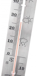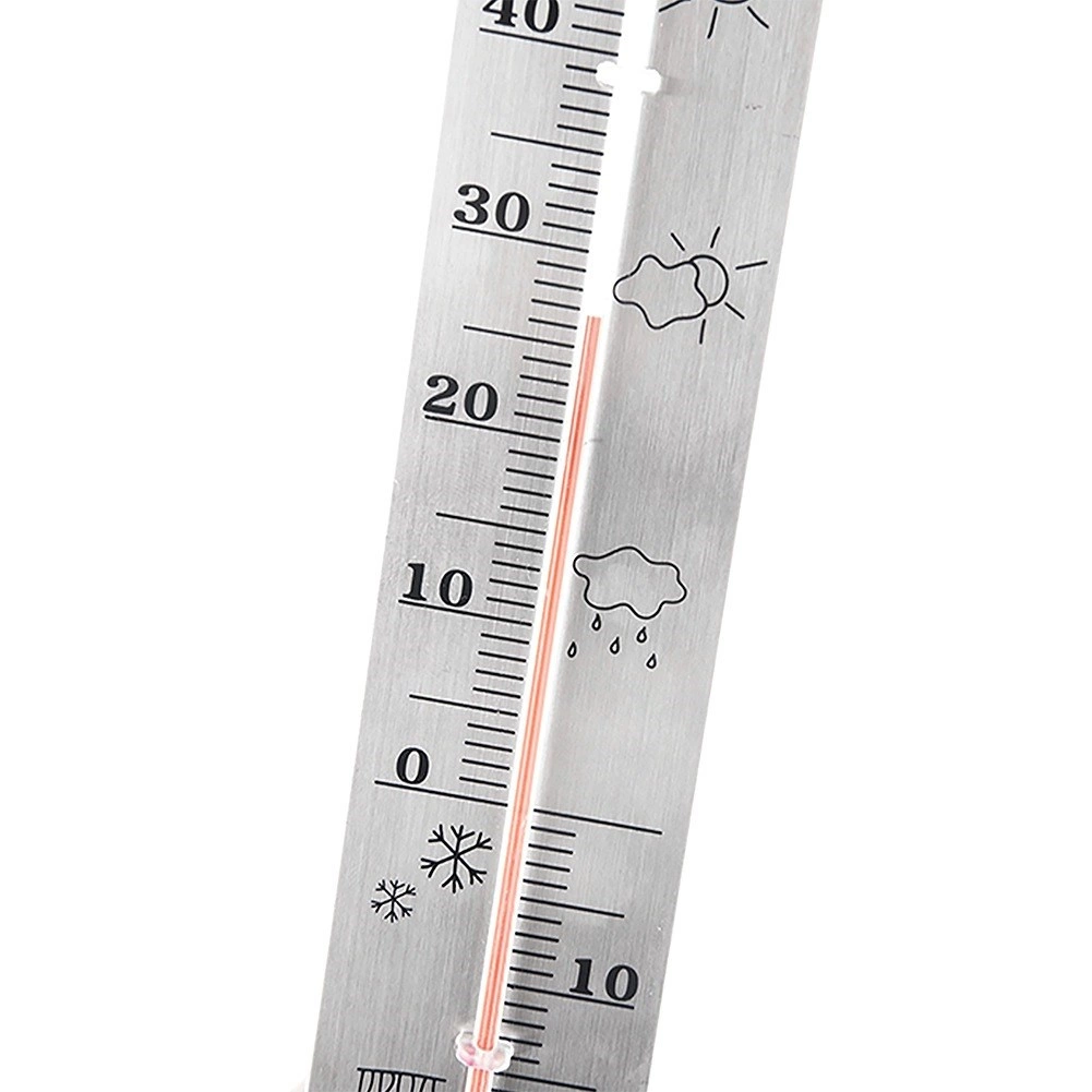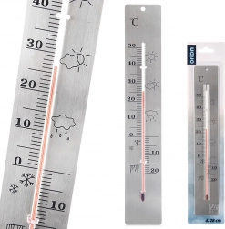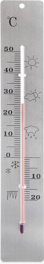 Klasický analogový teploměr pro měření teploty doma i venku s rozsahem -20 °C až 50 °C. Vyroben z nerezové oceli v elegantní stříbrné barvě, bez rtuti (naftová náplň). Díky čitelné stupnici a možnosti zavěšení na zeď se hodí na balkon, terasu, do zahrady i interiéru. Rozměry 4,5 × 28 cm.