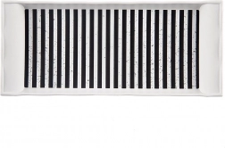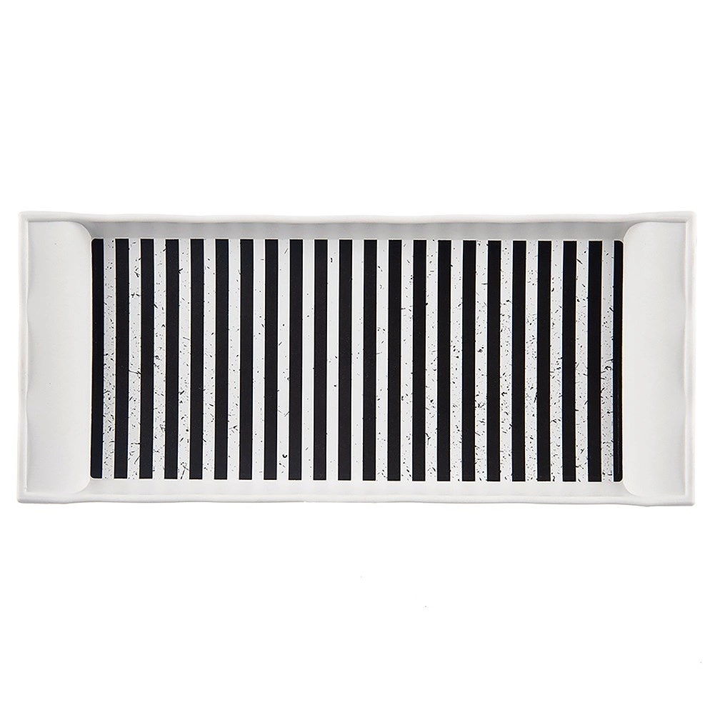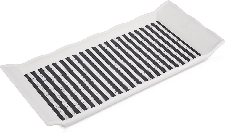 Stylový a praktický servírovací tác s kontrastními černo-bílými pruhy udrží šálky, sklenice i talířky jistě na místě. Vysoké okraje usnadňují bezpečné přenášení a hladký povrch umožňuje rychlé a snadné čištění. Skvěle se hodí na kávu, čaj, zákusky i drobné občerstvení.