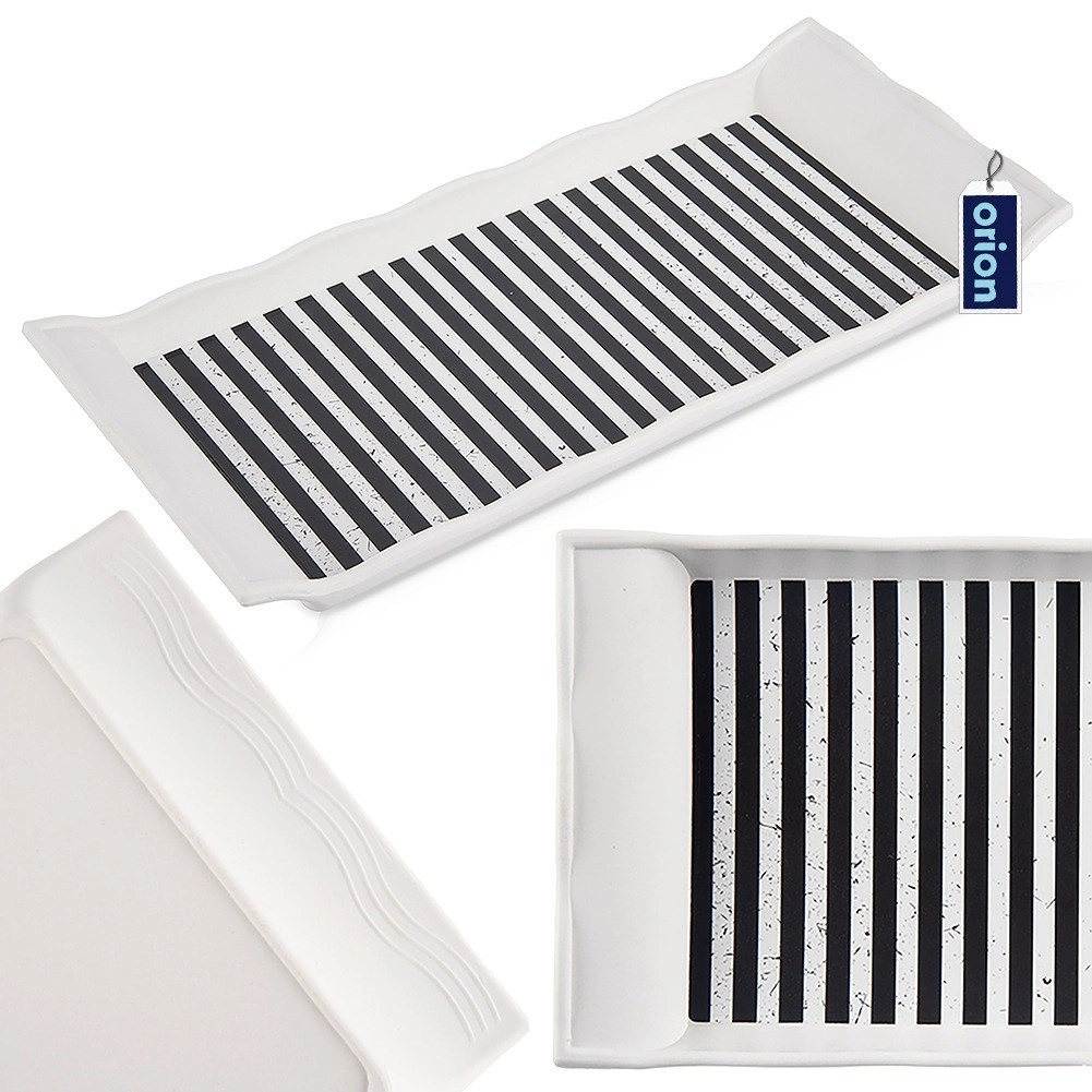 Elegantní servírovací tác v obdélníkovém tvaru o rozměrech 29,5 × 13 × 3 cm pro pohodlné podávání kávy, čaje, dezertů a snacků. Díky protiskluzové pruhované ploše jsou nápoje a talířky při přenášení stabilní. Tác je z odolného plastu v bílé barvě, snadno se čistí a je vhodný pro domácnost i gastronomii.